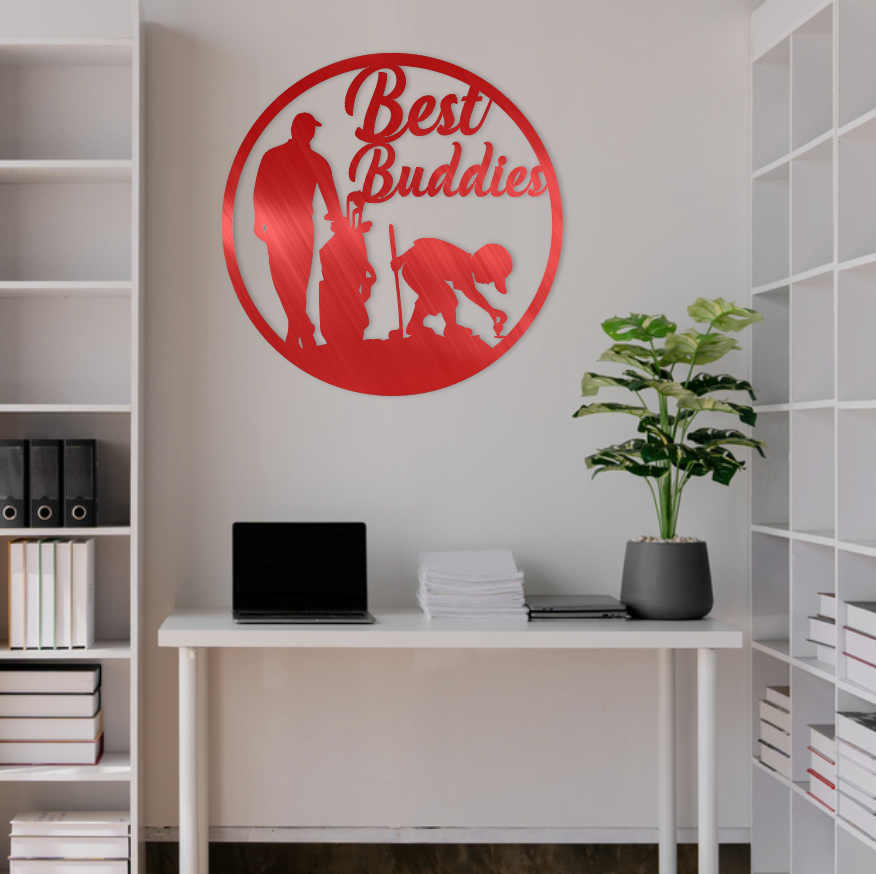 Made with durable 16 gauge steel and powder coated for longevity, this metal art piece depicts a kid and dad enjoying a round of golf. Perfect for any golf enthusiast, this piece will add a touch of love and family to any space.