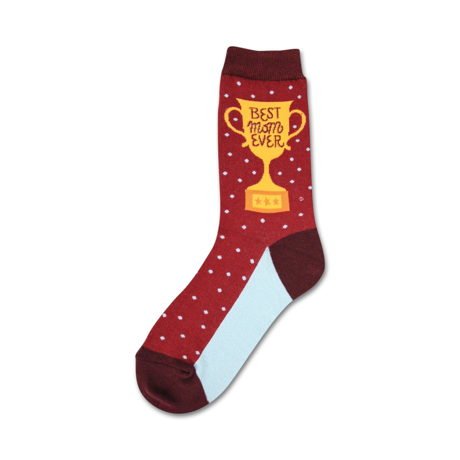 Show mom she's the best with these comfy crew socks that come with a lovely compliment. With the words "Best Mom Ever" spelled out in big bold letters against a red sock with white polka dots, she'll know you think she's number one. Take a chance on one of our best sellers and show Mom your love. Mom's smiles per hour guaranteed to go up after opening this adorable gift.