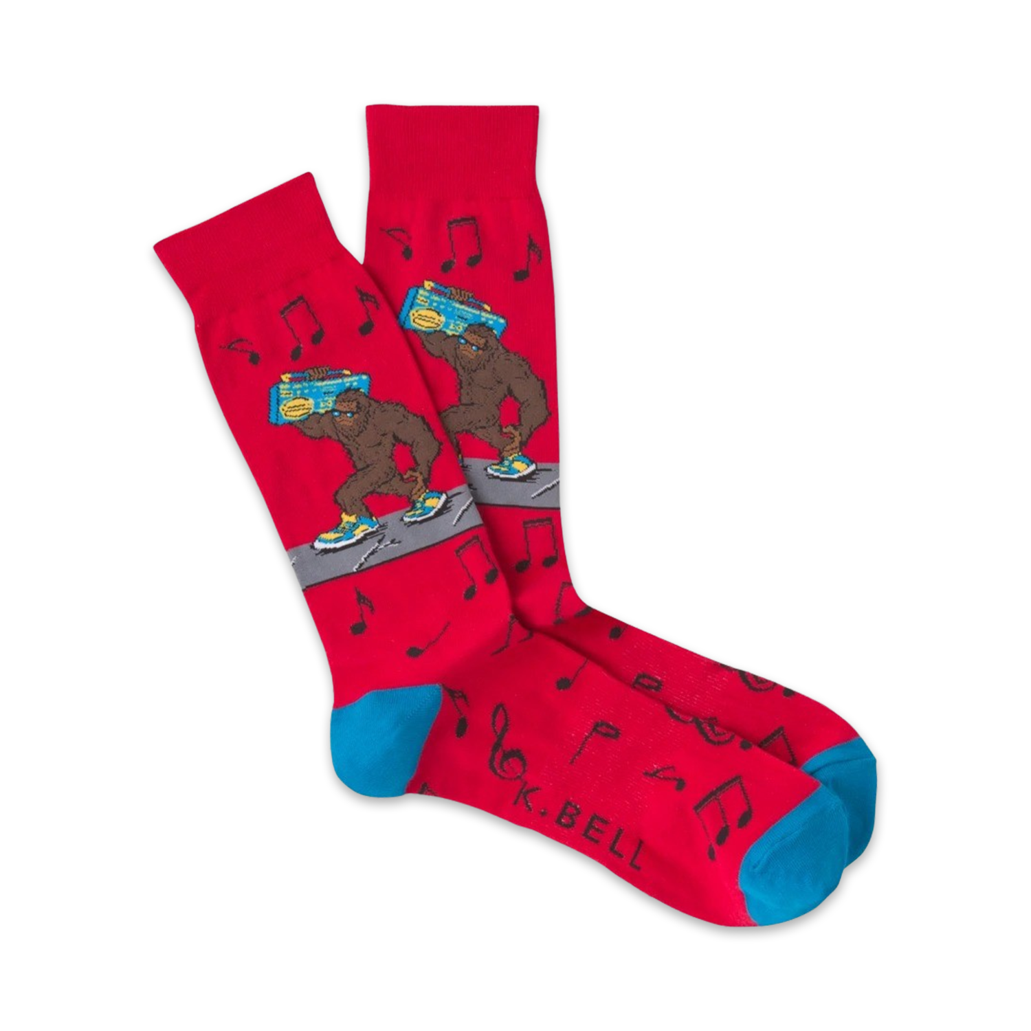 Rock out with your fur out! These stylish yet silly socks are perfect for hitting the streets on a hot summer day. Each pair of red and blue crew socks features a floating musical note print with Bigfoot jamming out to his favorite beat wearing a slick pair of kicks.