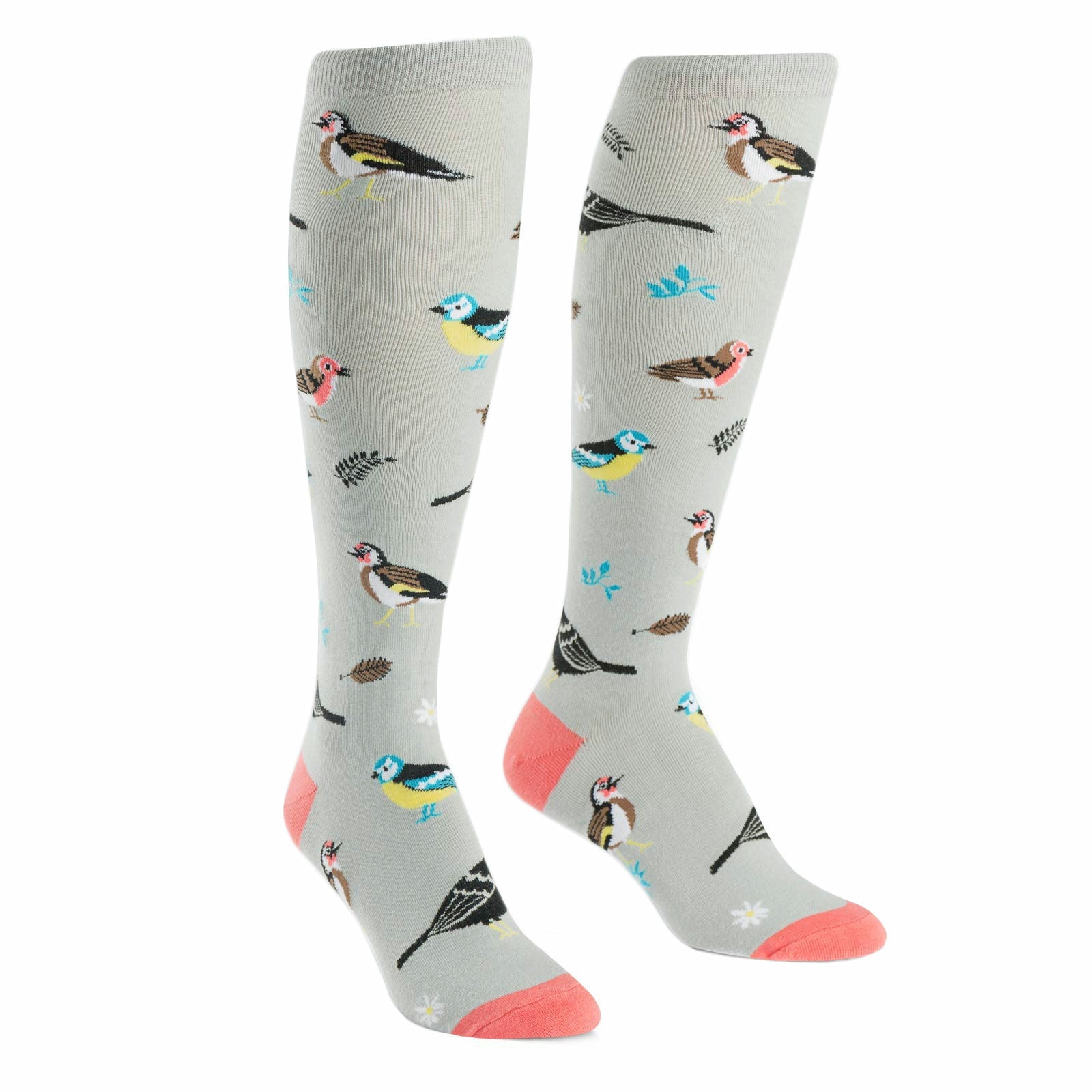 These magnificient flocks of birds will fly up your knees! Each cool pair of gray knee high socks feature several different varieties of song birds along with their feathers for a chirping good pattern. Whether you're an avid bird watcher or just someone who enjoys nature, these fun novelty socks would make a great addition to your sock drawer.