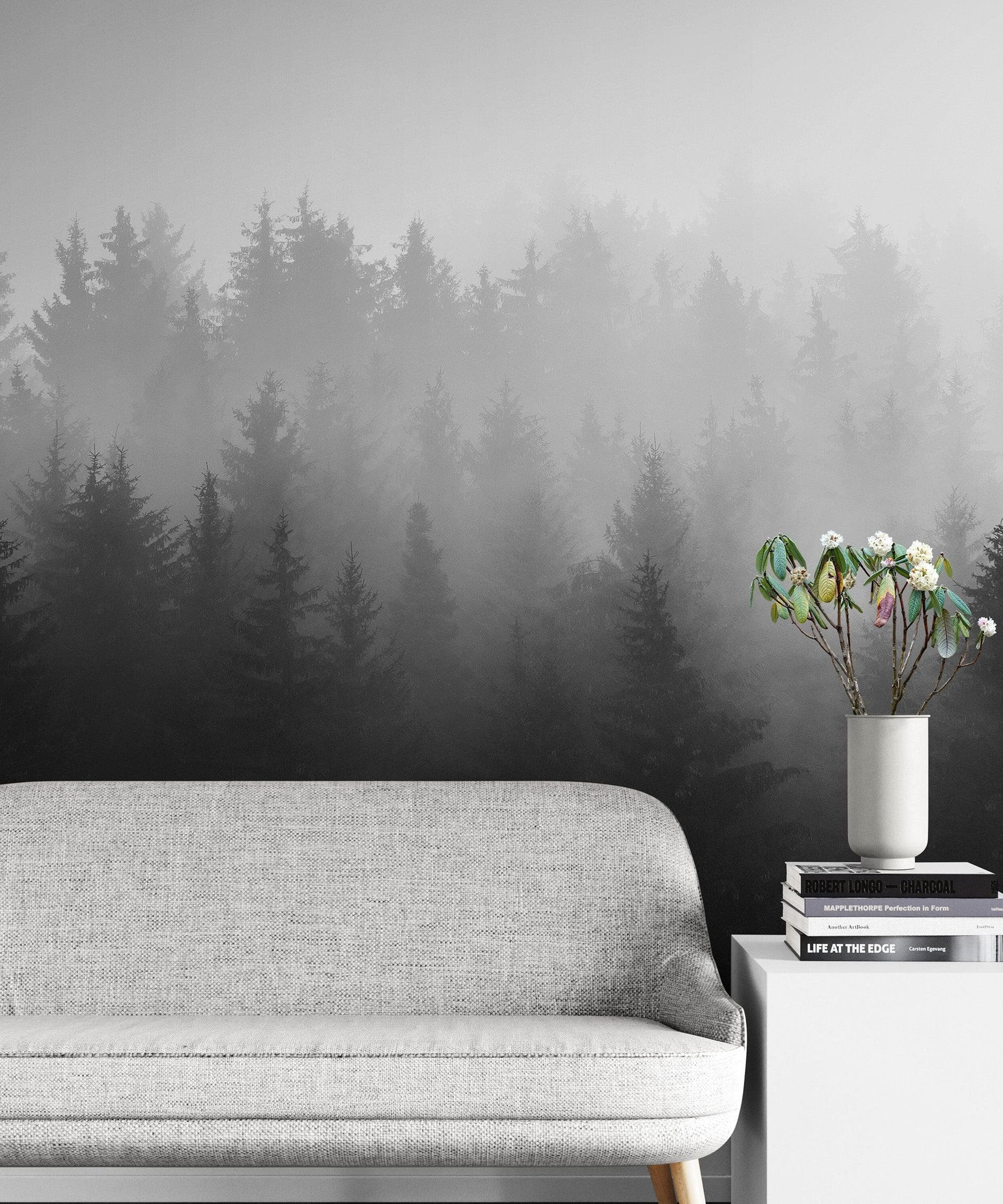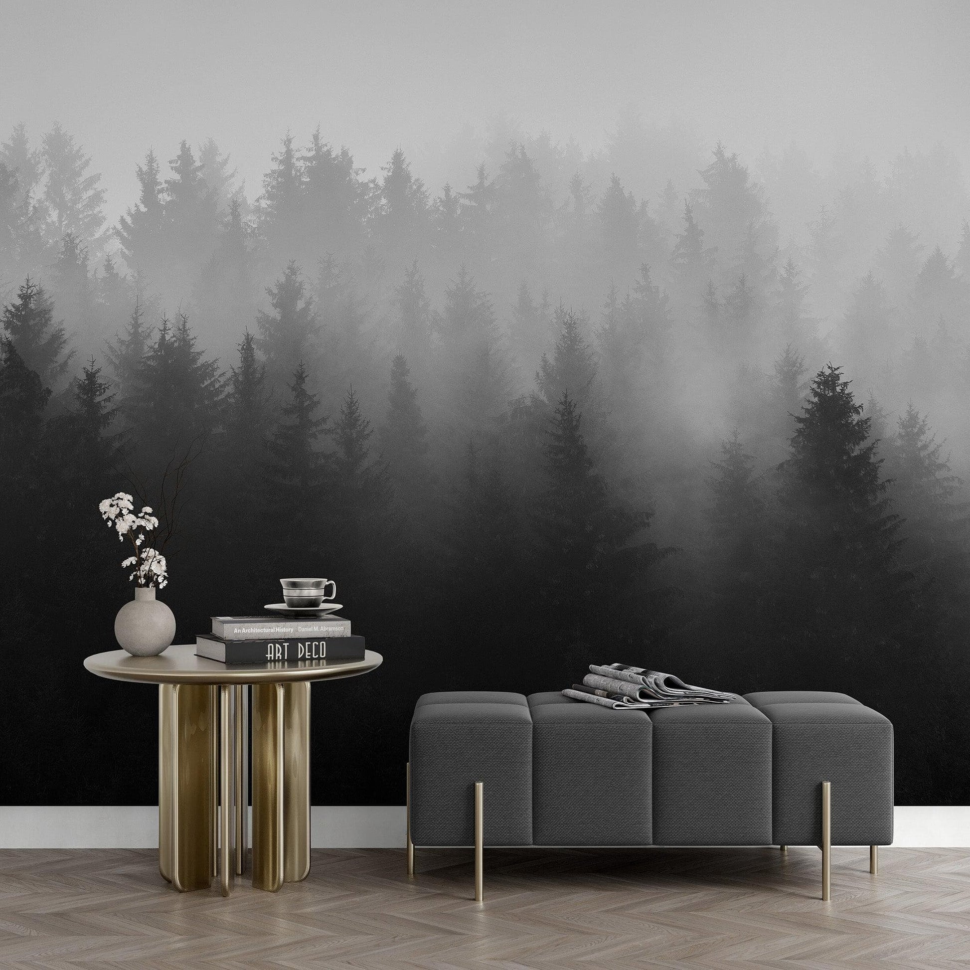 Black and White Misty Pine Forest Wallpaper. #6673