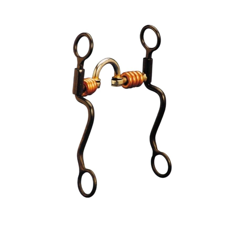 This is a strong leverage bit, designed to establish control. 8 " black steel cheeks. 5" copper, double hinged mouth with copper rollers for moister mouth in horse. Long barrel "No Pinch" where mouth attaches to cheek.
