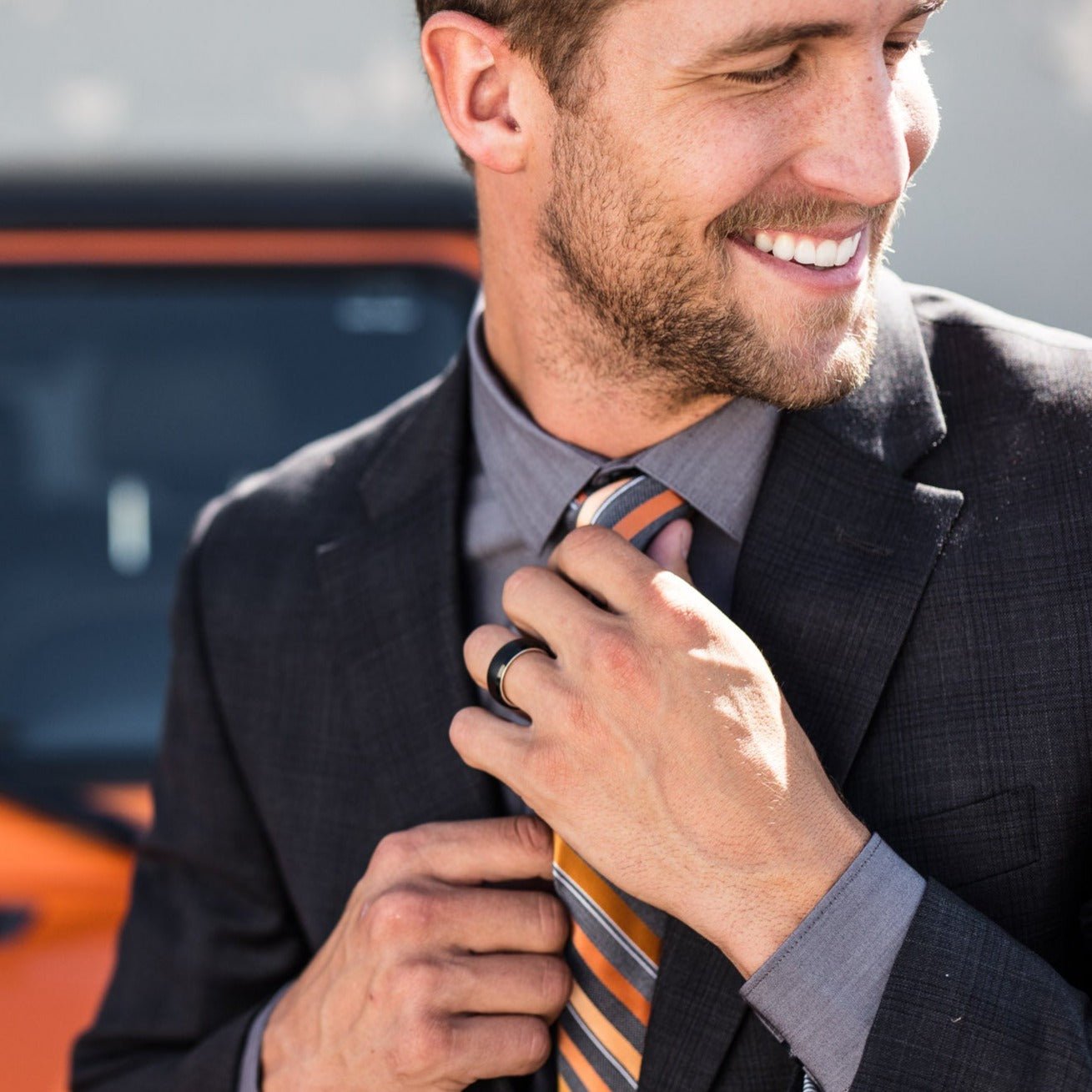 The process of creating the EMBR black tungsten band begins with taking a high-strength tungsten powder that’s combined with carbon to achieve its amazing strength. Each ring is then compression molded, sintered and polished, resulting in a remarkably smooth surface and an exquisite shine. The rich, luxurious shade of black tungsten carbide results from a PVD process, which deposits thin layers of color in a high temperature, vacuum environment. This process permanently changes the exterior surface color of naturally gray tungsten carbide to a deep onyx black.