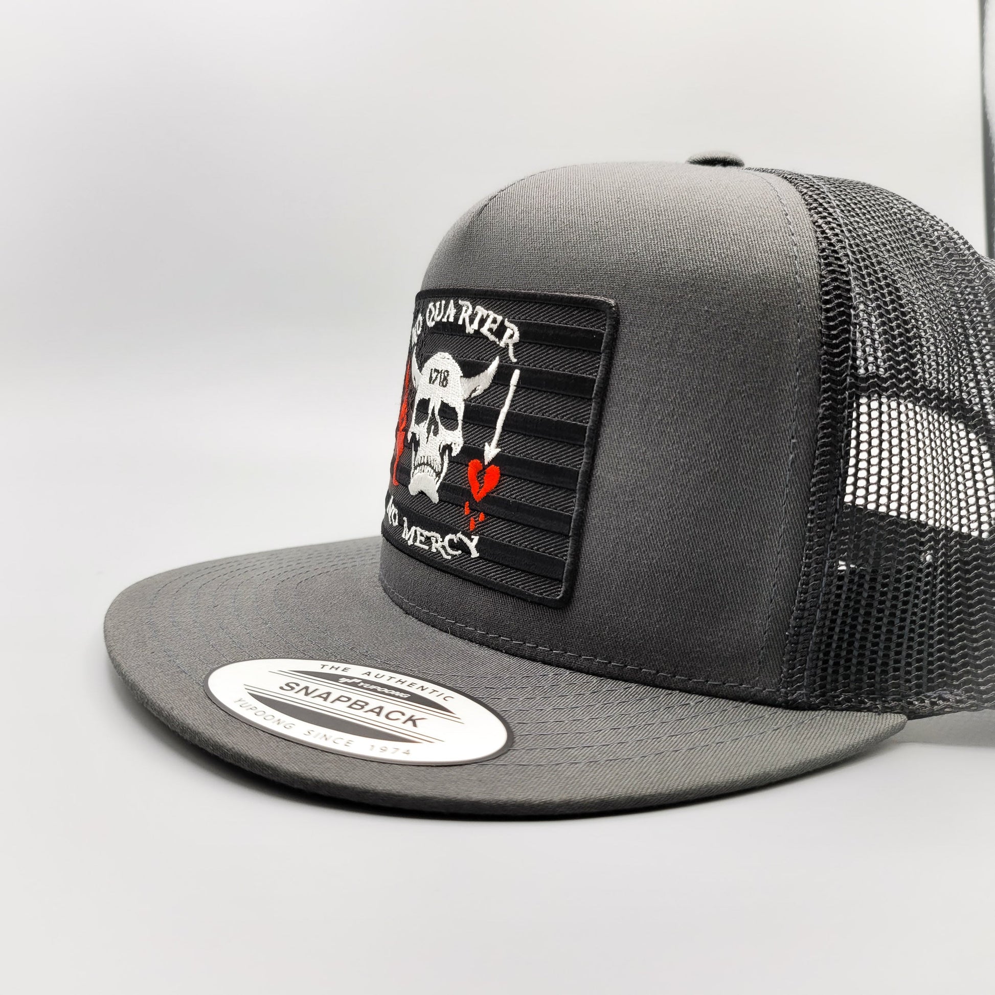 Show your patriotic pride with this retro trucker patch hat that features an embroidered logo patch with "No Quarter, No Mercy" over a blackened American flag.