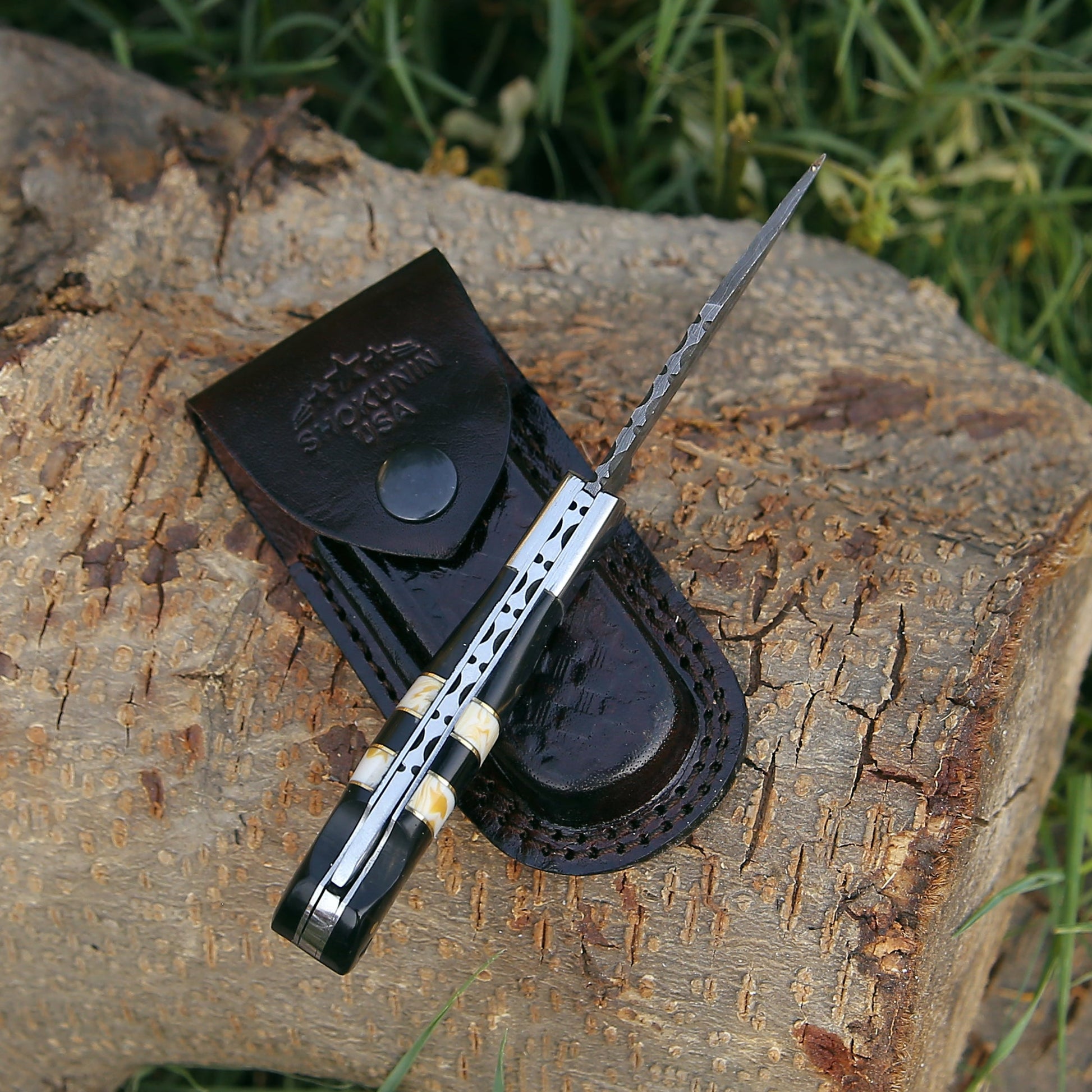 Blaze Handmade Custom Clip Point Gentleman's Damascus Folding Knife - 7.5" Overall with Composit Resin Scales, Lock Back Pocket knife with Hand Stitched Leather Sheath, Pro Knife Sharpening, Spare Pocket knife Sharpener & Personalized