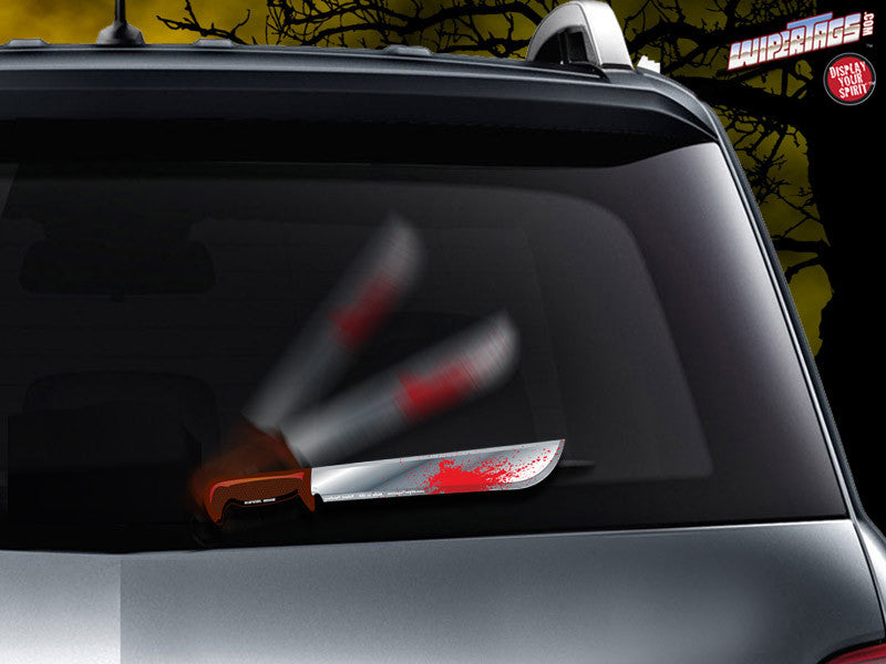 This awesome bloody machete will make people around you think you're a lunatic. Universal size attaches securely to your rear wiper. Double-sided for left and right sided rear wipers. Measures approximately 15" x 2".