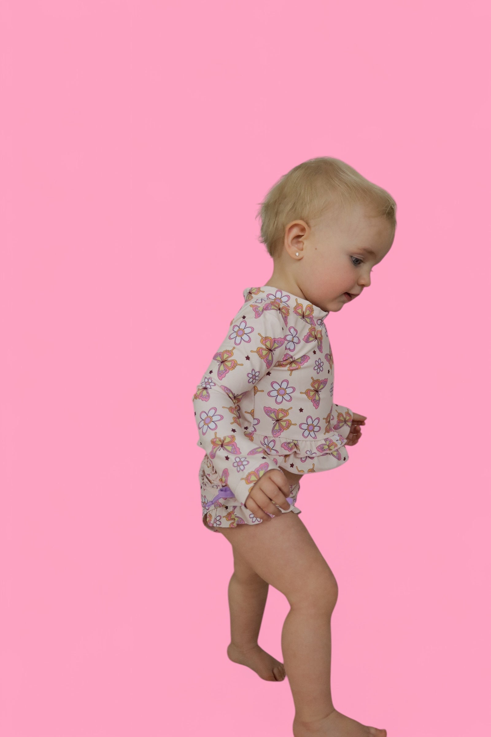 Say hello to sunny days with the Blossomin’ Butterfly Dream 2-Piece Rash Guard Ruffle Swim Suit! This swim set is as cheerful as a garden in full bloom, featuring a lovely butterfly and floral print with soft pinks, yellows, and lavender. The colorful butterflies flutter across the fabric with delicate wings, while daisy-like flowers add a pop of charm. And don't forget the twinkling stars scattered throughout, making it extra magical!