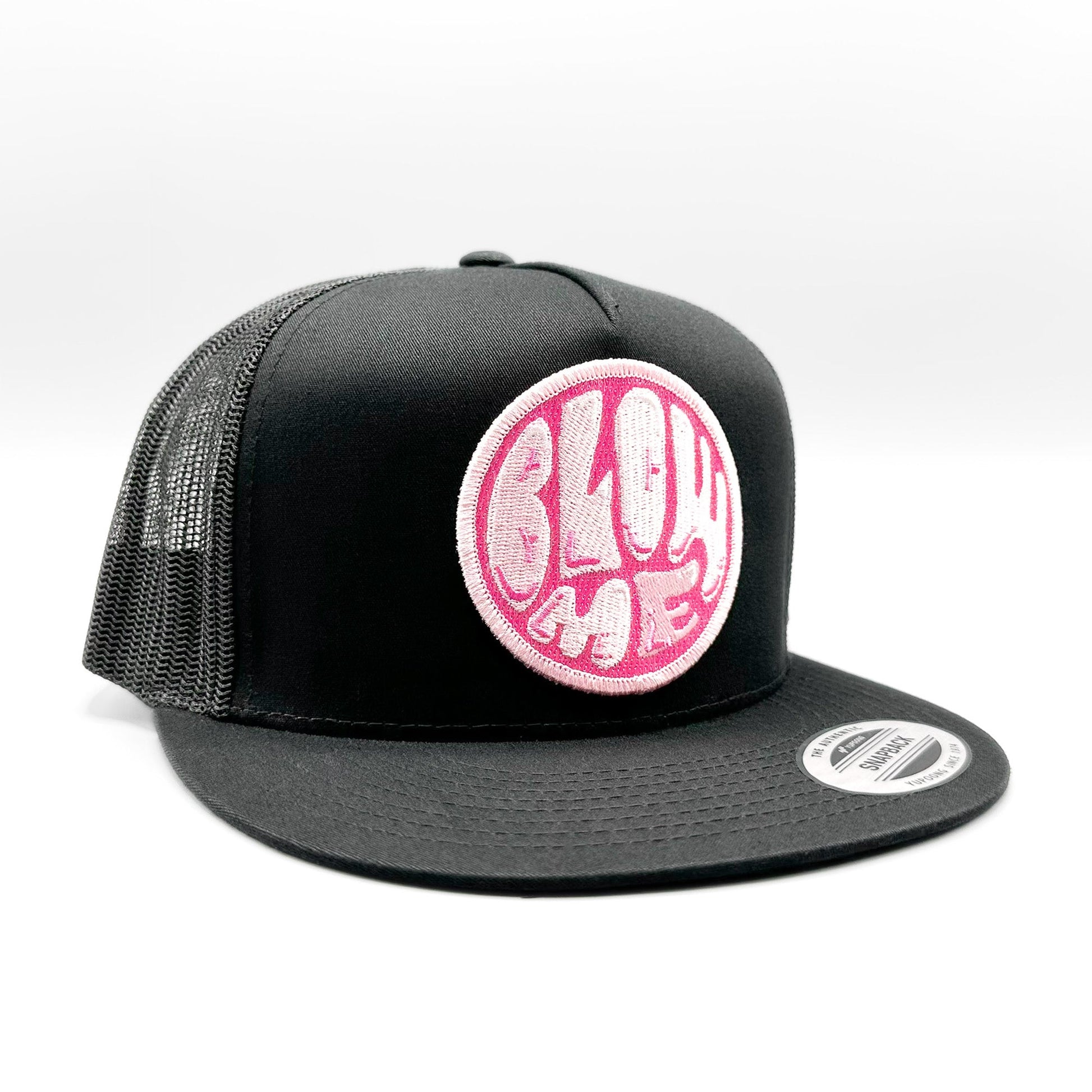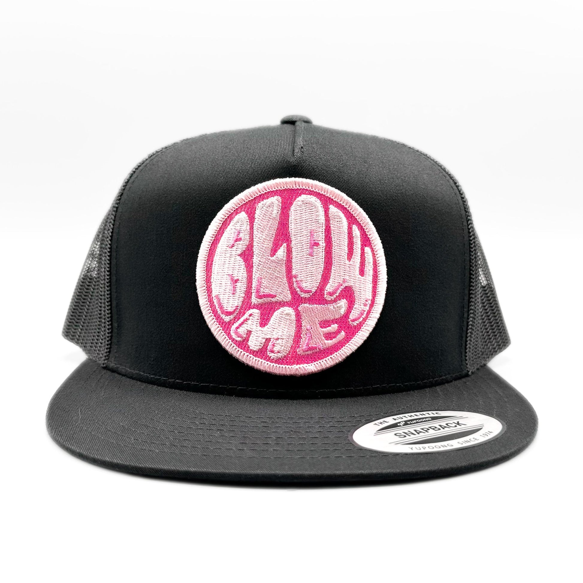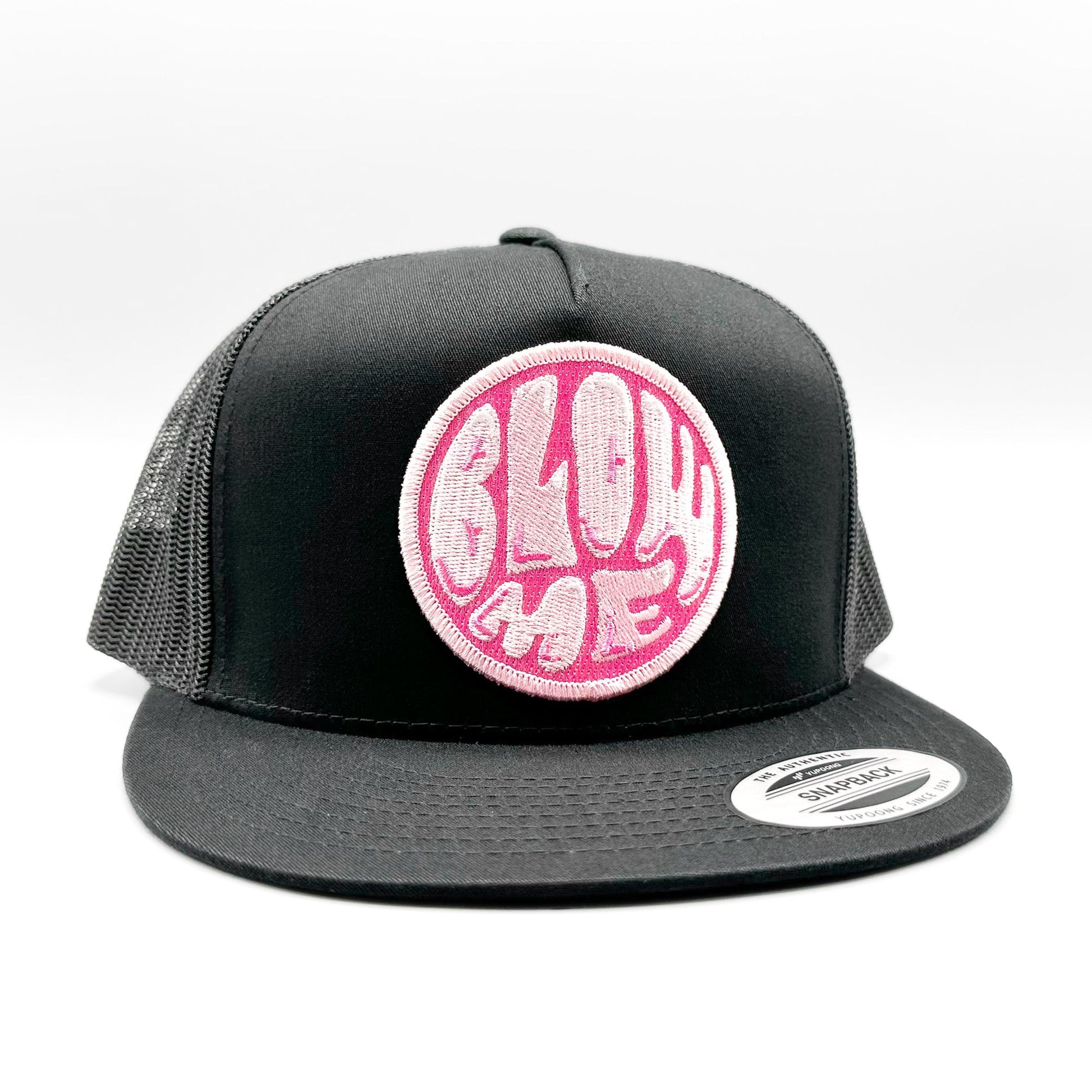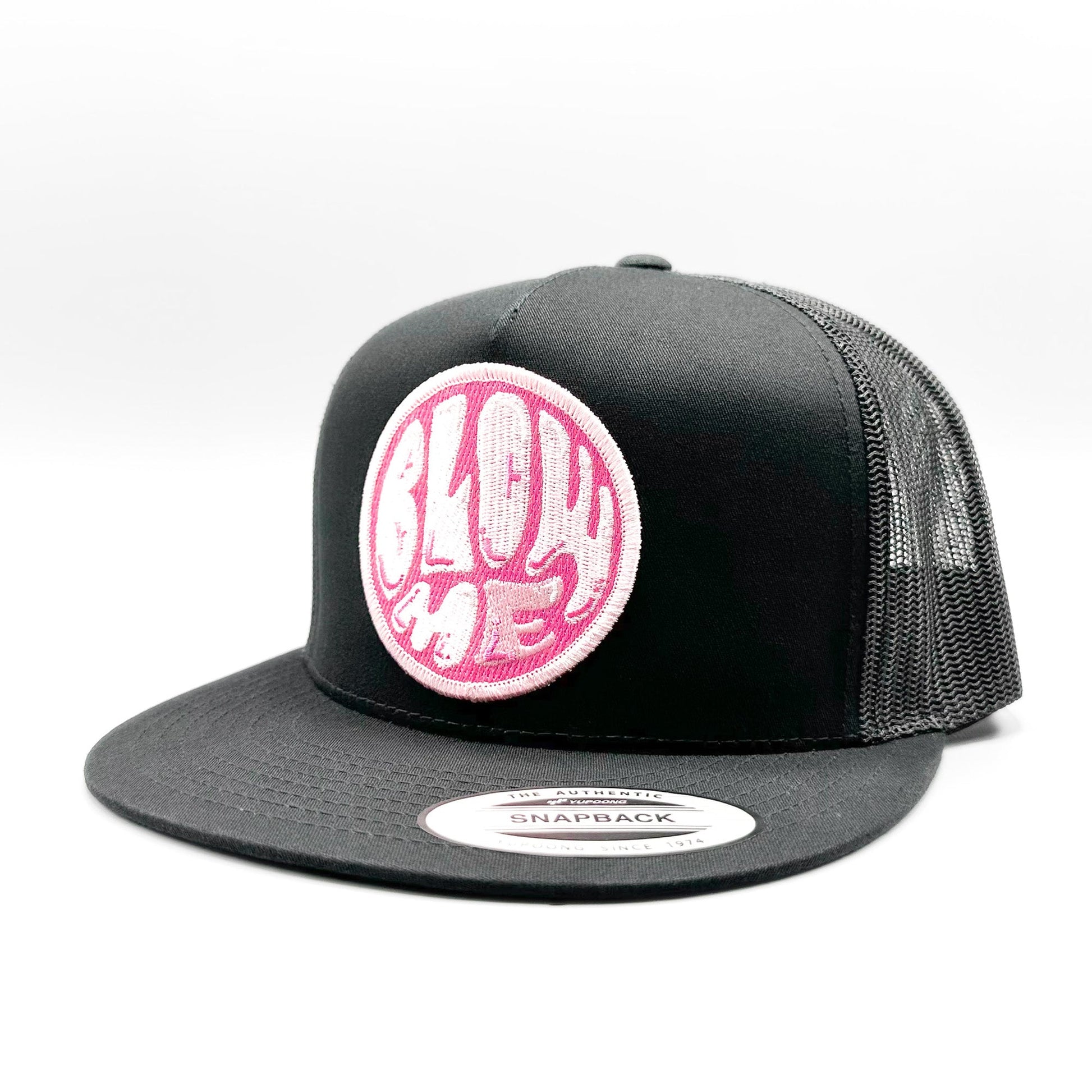 The Blow Me retro bubble-gum patch trucker hat is featured with a traditional mesh back and adjustable snap closure, making it the choice for any fan 70s logos and design. The retro embroidered patch on the front adds a touch of nostalgia and makes this hat a must-have for any fan of pink bubble gum, baseball card packs and those good old childhood days. This limited-edition patch is paired with one of our best-selling (and best fitting) baseball style trucker hats - a black Yupoong 6006 Classic snapback trucker hat.