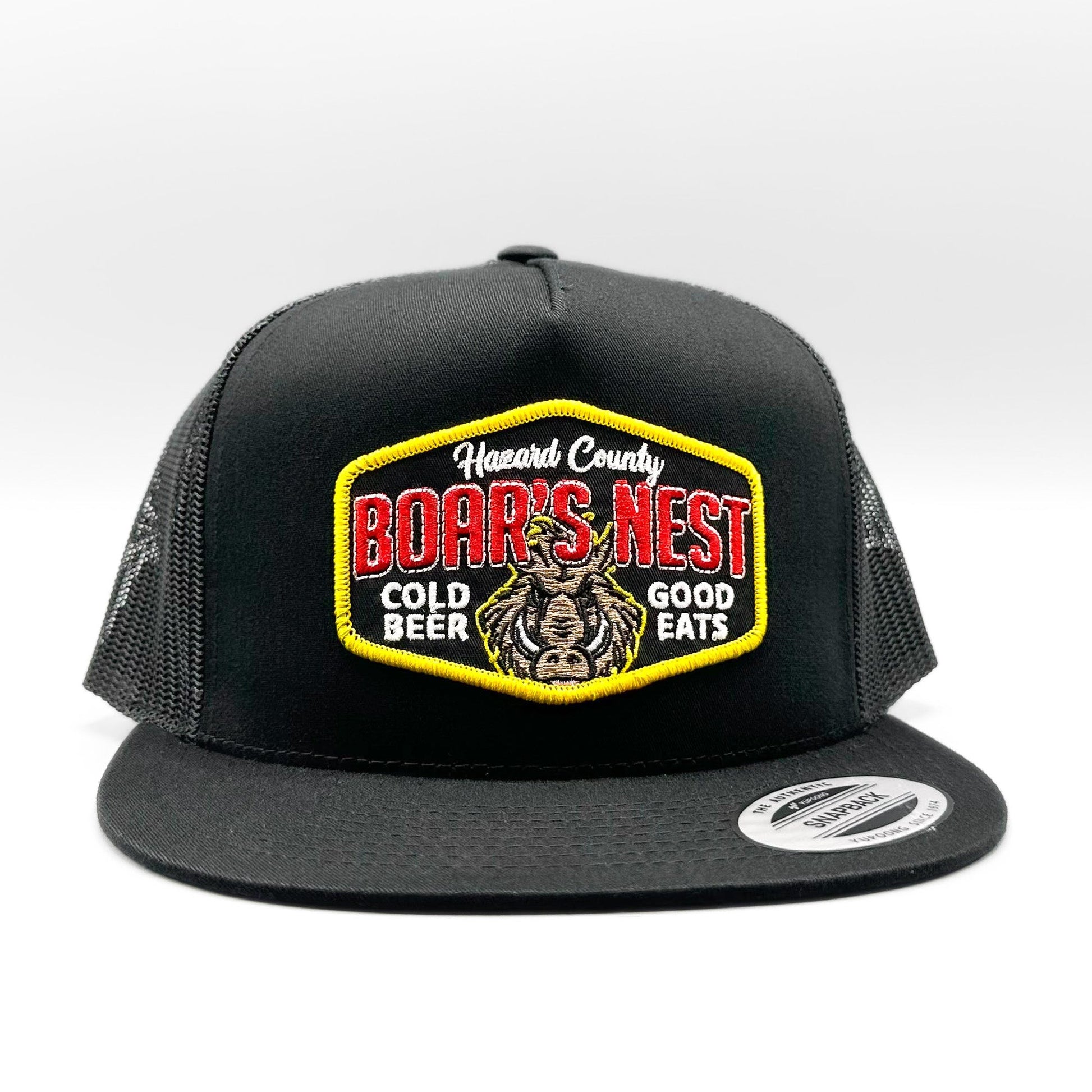 The Boar's Nest retro patch trucker hat is a popular item for fans of the classic TV show and movie "The Dukes of Hazard." The hat features a patch with the iconic Boar's Nest logo on the front. The Boar's Nest was a local bar and hangout spot in the fictional town of Hazard County, where the show took place.