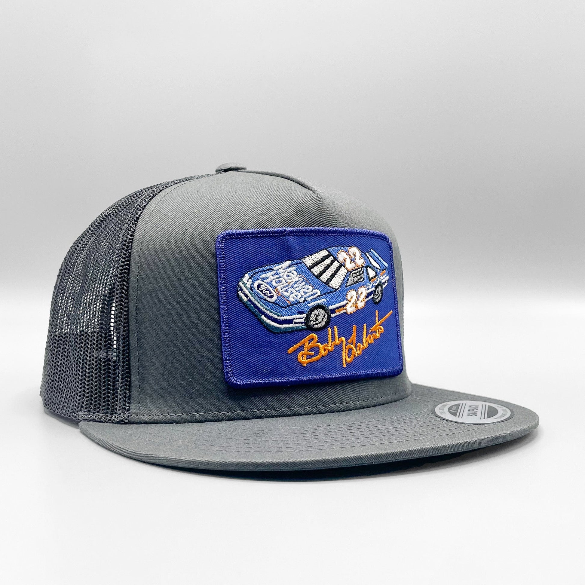 This trucker features a blue and orange "Bobby Labonte Maxwell House Racing" Nascar #22 Ford Racing patch on a new charcoal gray Yupoong 6006 Classic mesh snapback hat.