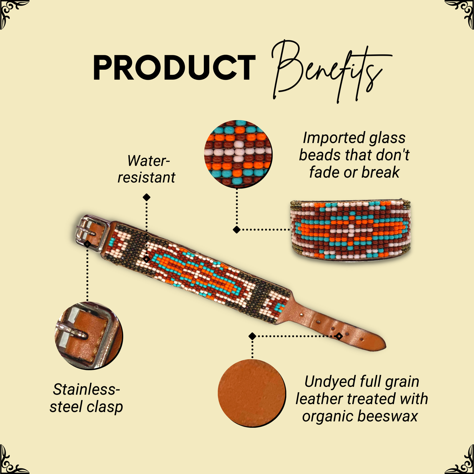 This incredible beaded bracelet from Sambboho is the perfect addition to your jewelry box. Fully handmade by female artists in Brazil. Premium leather bracelet made with world renown Slovakian glass beads. Our leather is un-dyed, full grain, and treated with organic beeswax for water resistance. Western, bohemian and native inspired designs with vibrant colors. Sustainable shopping! Your purchase allows these women to be financially independent and safe. Thank you for making a difference in their lives. This bracelet matches with the dog collar, hatband and belt from the same collection! Hypo allergenic stainless-steel closing. Flexible leather, very comfortable to wear for an extended period of time! As always, your purchase comes with a 30-days return policy and a 1-year warranty. Fast free shipping from the US.