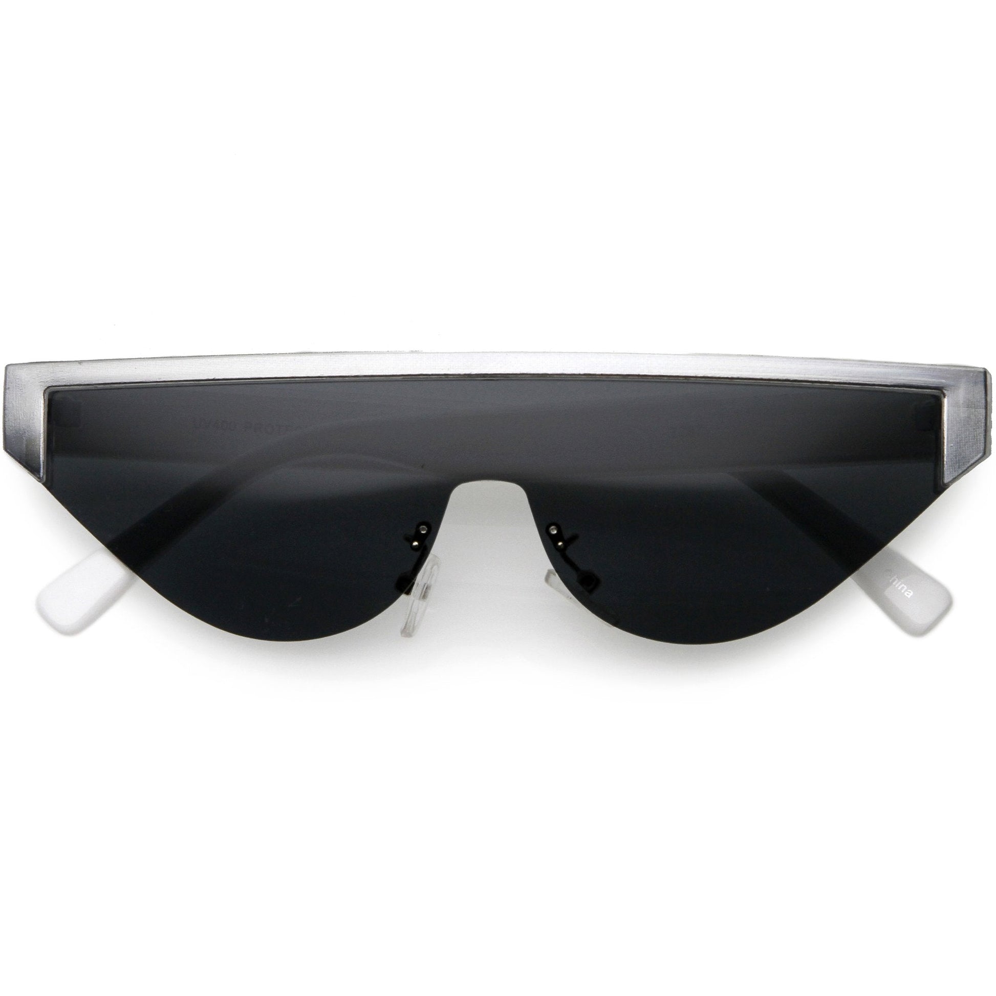 - Designer-inspired eye-catching cat eye sunglasses that features a flat top semi-rimless frame. Part of our cat eye sunglasses collection this season, this pair of shades adds a chic vibe to your everyday wardrobe. Made with a plastic based frame, metal hinges, and UV400 protected lenses.