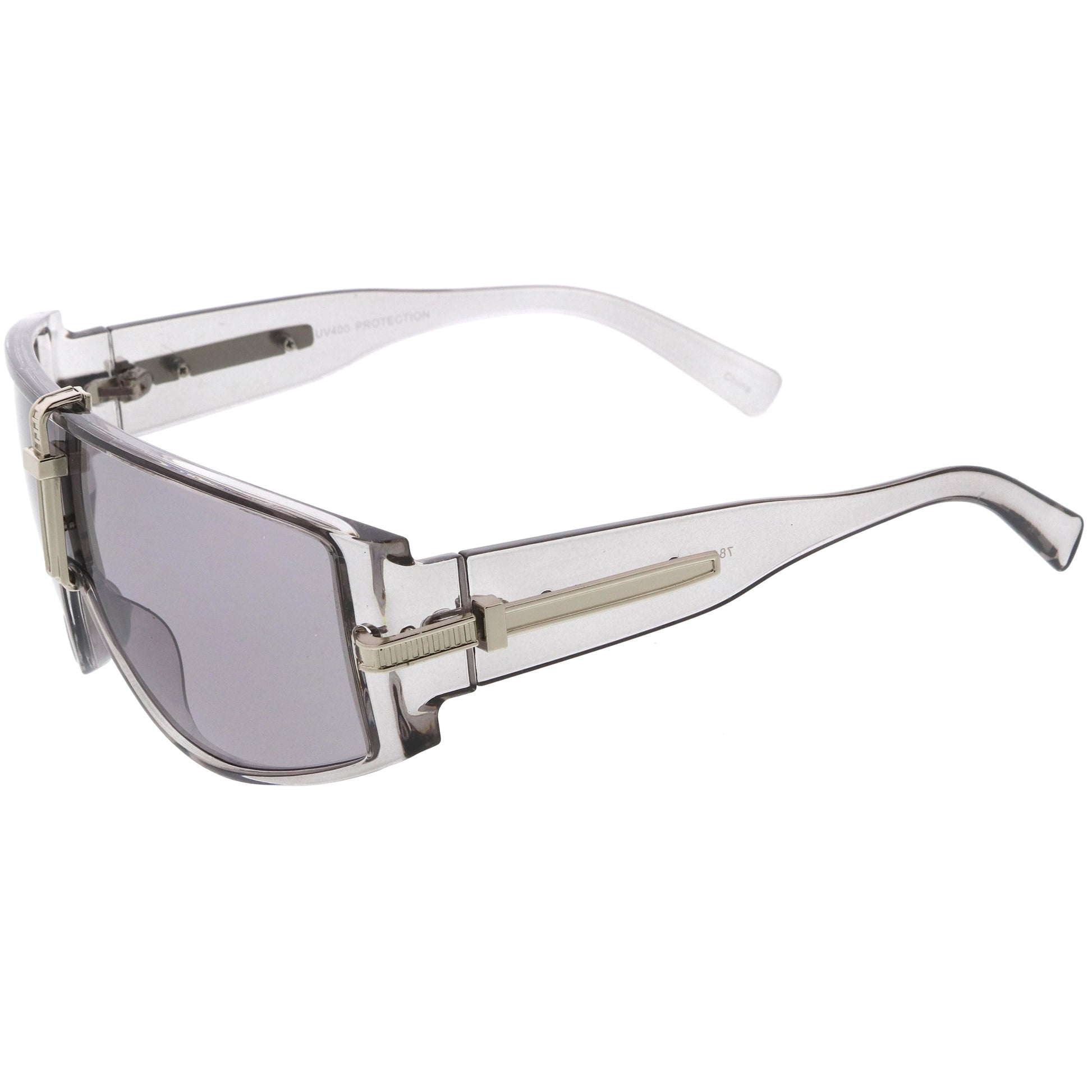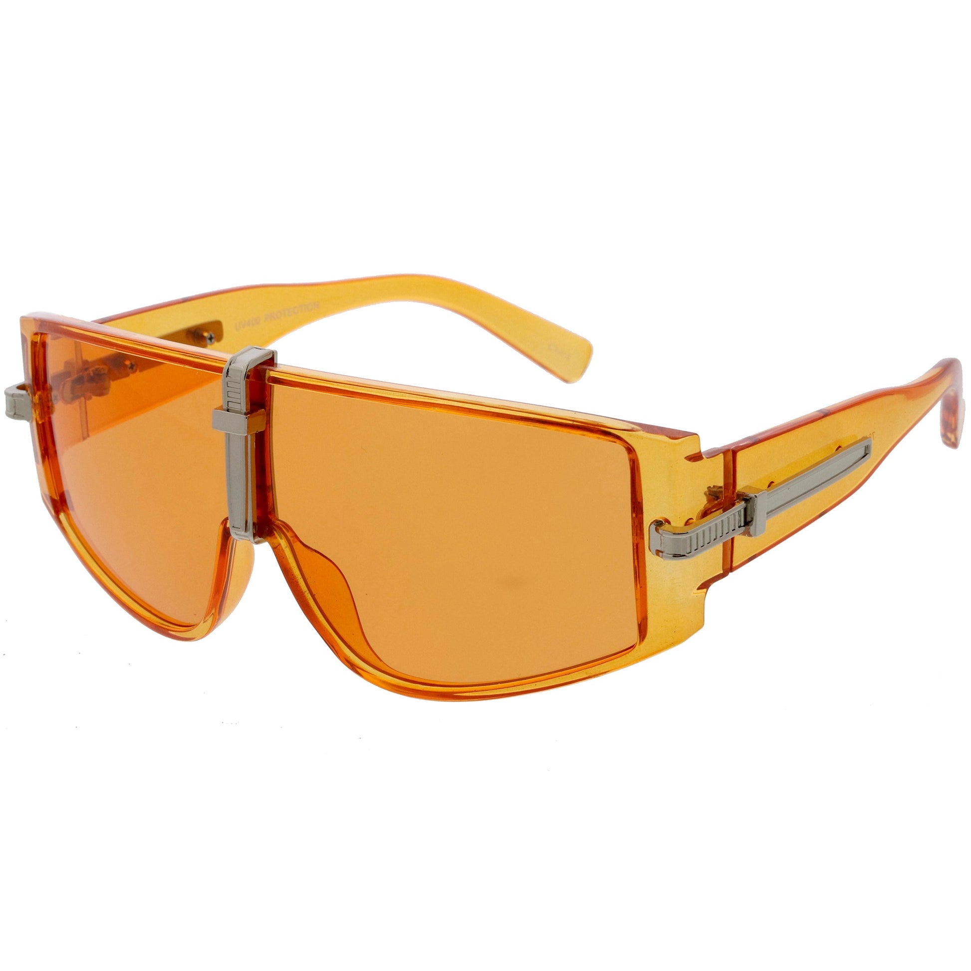 - The perfect combination of class and style, these shield sunglasses feature a rounded curved flat top design. Completed with premium metal accent along the nose bridge and temples for a high fashion appeal that is perfect for anyone looking to add a special tough to their oufit. Made with a plastic based frame, metal hinges, and UV400 protected lens.