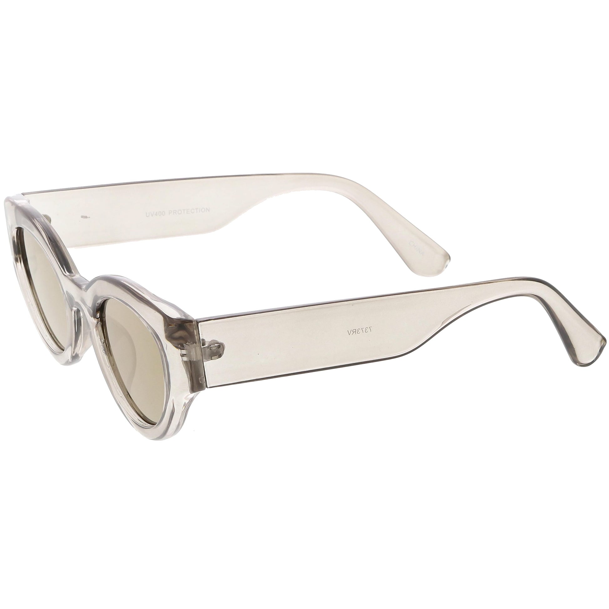 - Bold cat eye sunglasses featuring a thick frame and oval flat mirrored lenses. Accented with stylishly wide arms, these cat eye sunglasses are designed in matte and shiny finishes for a variety of looks. Made with a plastic based frame, reinforced metal hinges, and 100% UV protected lenses.