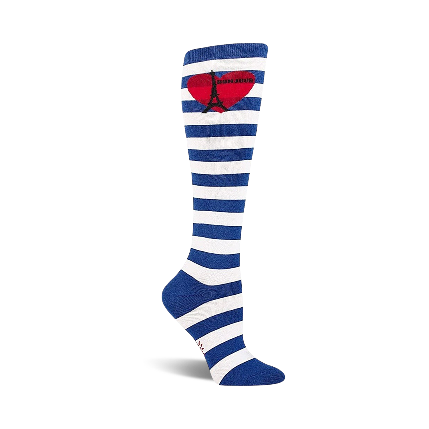Say bonjour to your new favorite pair of knee high socks! Traditional with the style of France, each cool pair of socks comes in a white and blue striped pattern. Just below the cuff is a heart with the Eiffel Tower inside a red heart. Beside the tower reads "Hello my friends" in French.