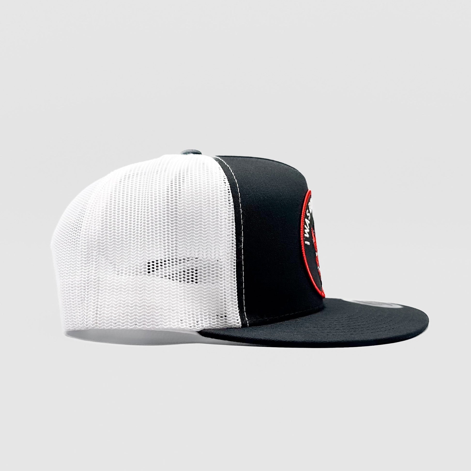 Retro-style "I Was Born Horny" embroidered naughty devil patch on a black and white mesh Yupoong 6006 mesh snapback hat.