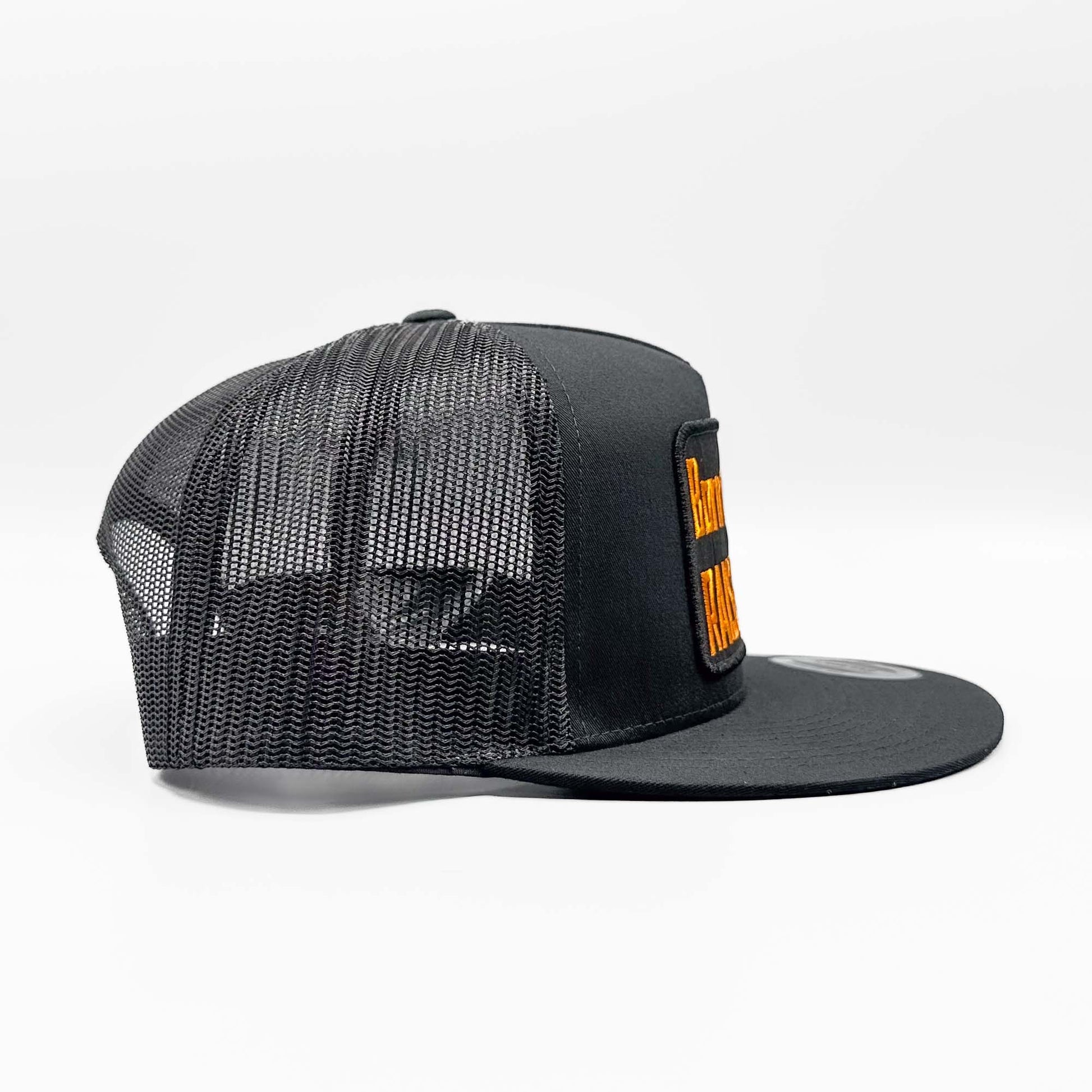 This retro trucker hat features a retro orange and black "Born to Raise Hell" embroidered patch on an all-black, premium Yupoong 6006 Classic high-crown mesh snapback baseball cap.
