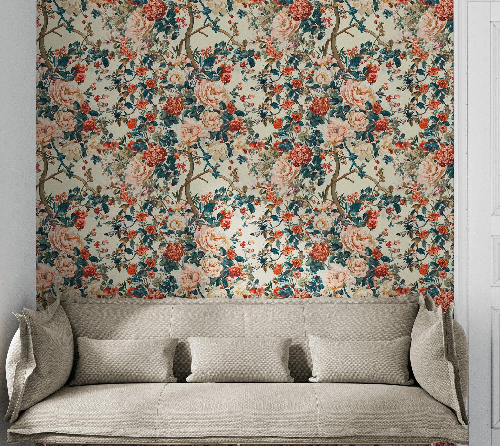 Botanical Flower Garden With Pastel Color Red, Green, Beige Background Wall Mural. #6771