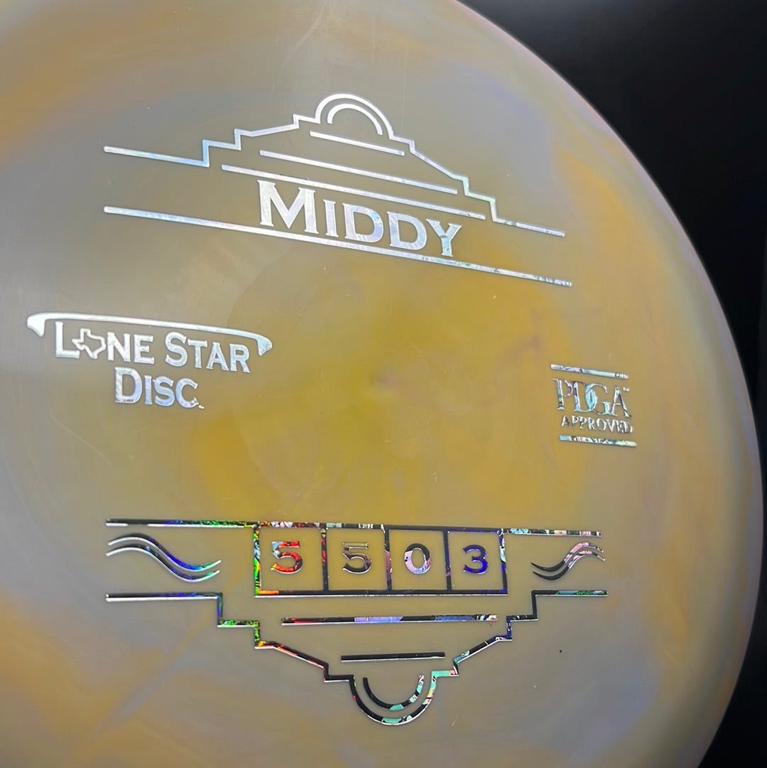 The Middy will be your new go-to midrange. It has a classic straight midrange flight with a nice bite at the end. It's the perfect, reliable mid from Lone Star Disc.