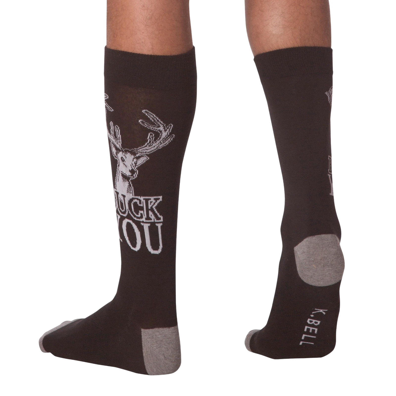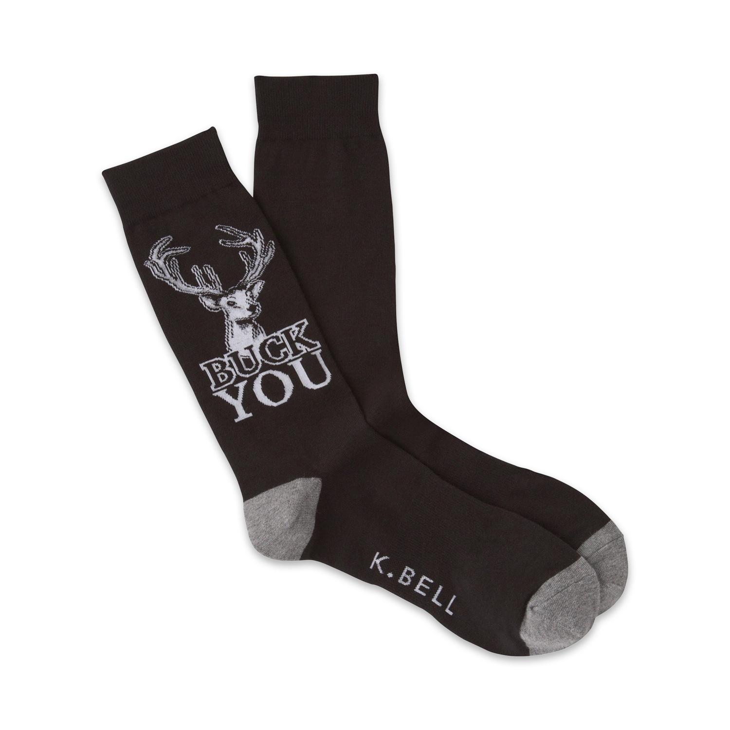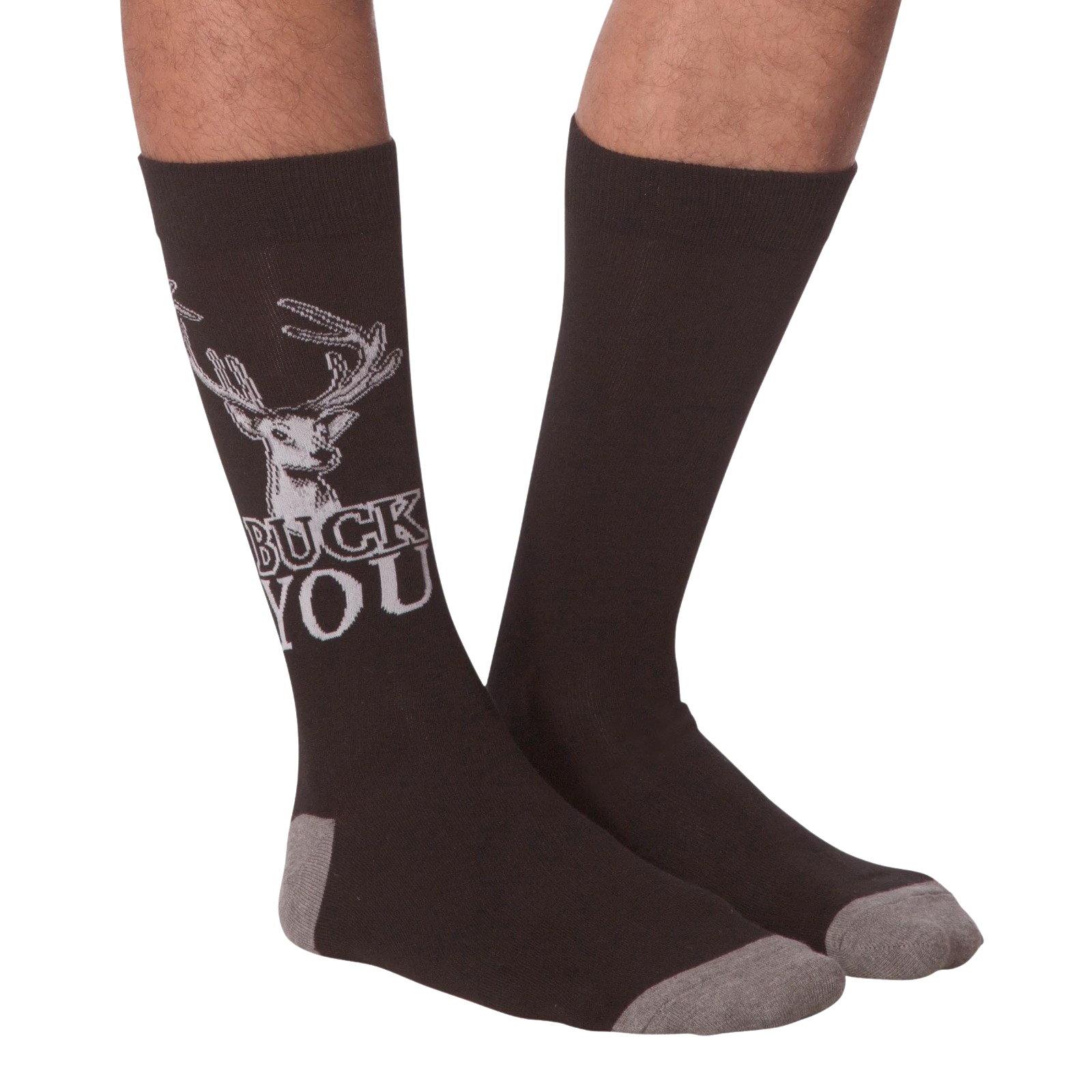 I'm quite fawn'd of you my deer, but if you are going to be a total jerk to me, you can just buck off! This funny pair of black and gray crew socks features a tough buck head with the phrase "Buck You" below him. Show some sass with your puns, we deer you!