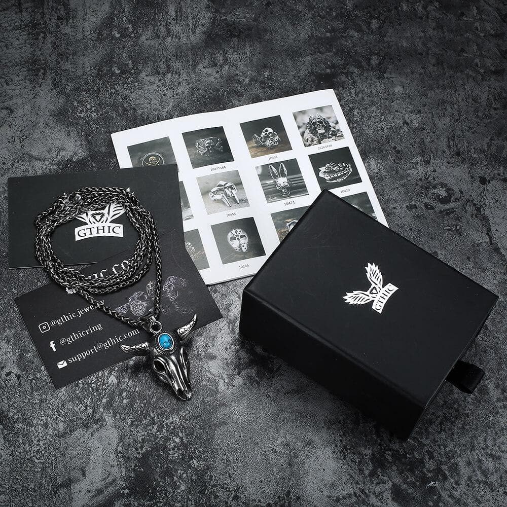 This is a vintage-style bull head skull pendant with turquoise inlaid on its forehead. Some Native American tribes believe that the bull skull is a symbol of life-long protection from all-natural elements. It is also associated with strength, courage, toughness, agility and so on.
