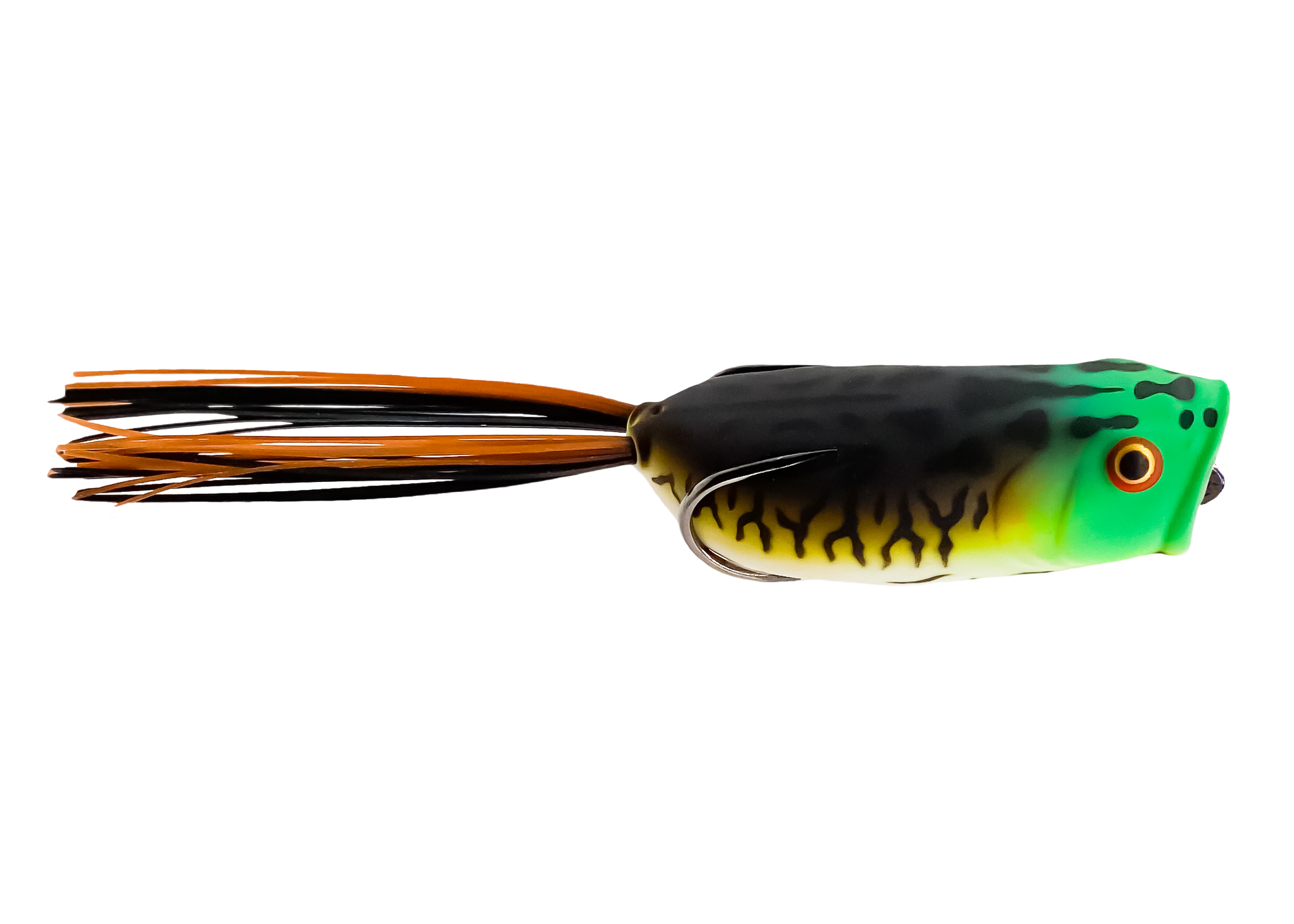 The specially angled nose and flat belly is designed to come up and over cover while preventing body roll that is seen on keeled belly frogs The body design and stream lined legs increase walking ability while keeping the leg material away from the hook points to prevent fouling. The Thumper is built around a custom designed hook that places the hook angles on top of the body for a superior hook up ratio. The custom made leak stop plug was built to help keep water out of the frog.