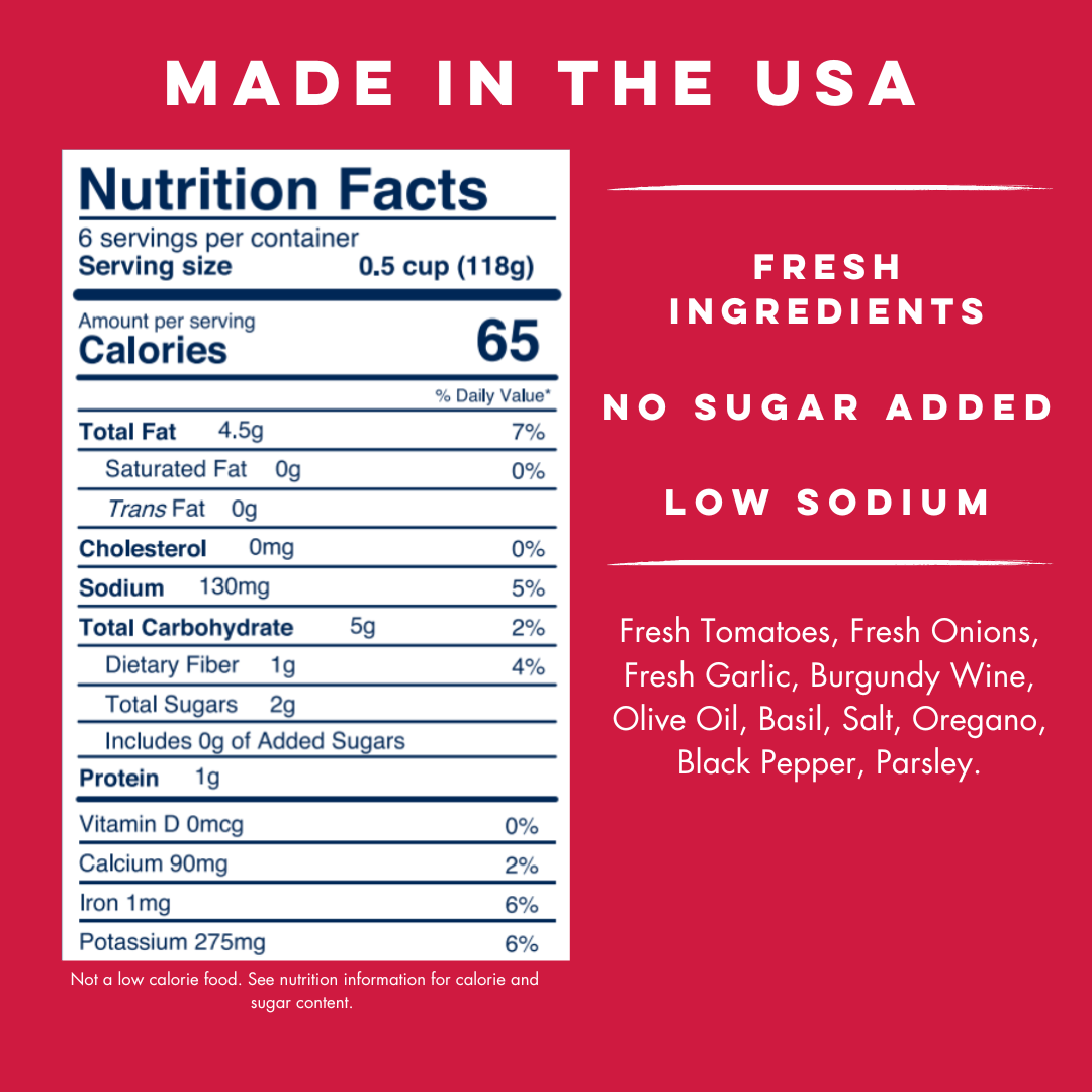 Yo Mama's Burgundy Marinara is handcrafted with imported French Wine, garden fresh tomatoes, garlic, onions, olive oil, and basil. Lovingly made in small batches, out Mama-approved recipe contains no added sugar GMOs, preservatives, or gluten.