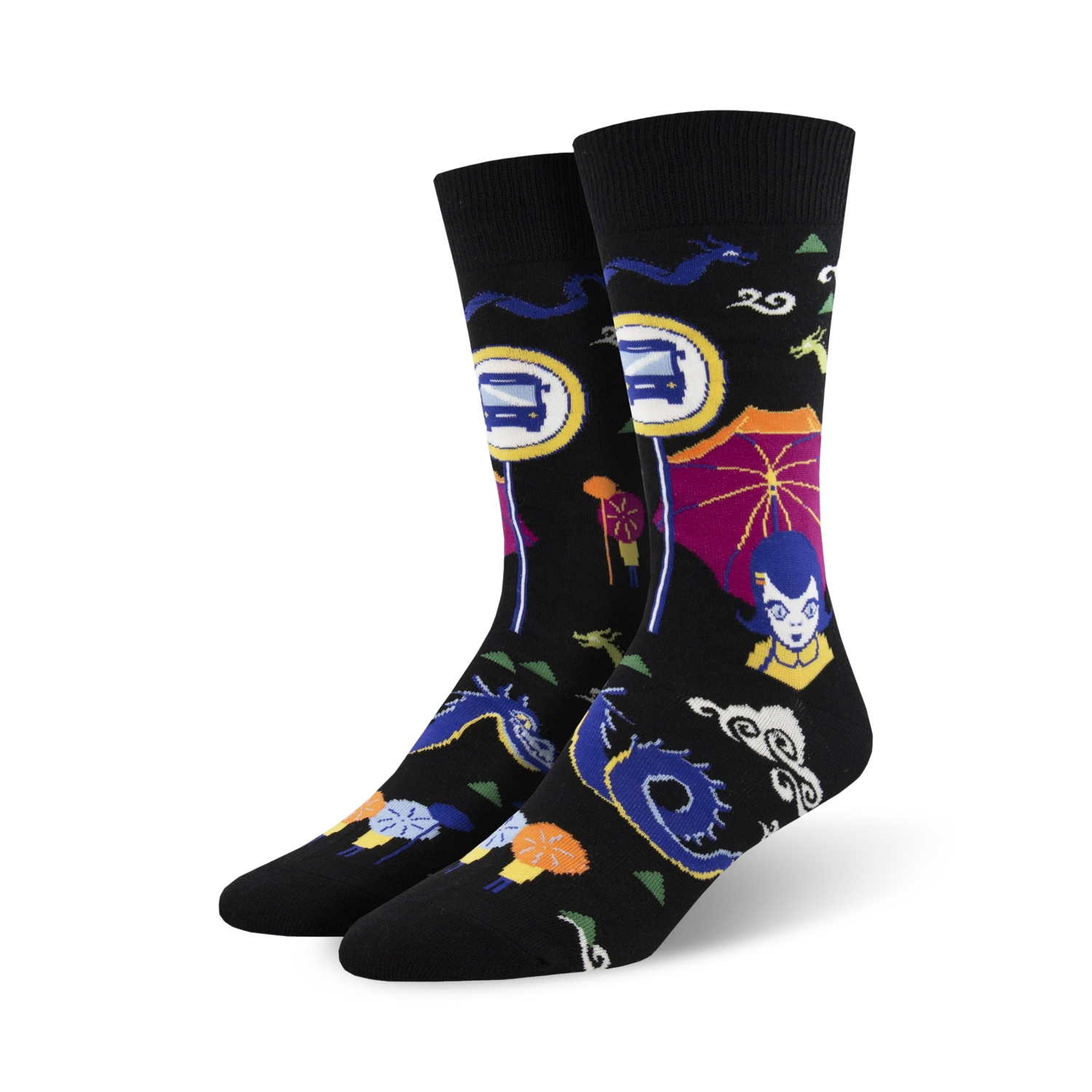 Hop on the bus and hold on tight as you journey through a world of funky black socks, vividly adorned with a quirky bus stop, a majestic dragon, a wise lady under an umbrella, and a glowing lantern. With the Bus Stop crew socks, your feet will be roaring with laughter and dancing to the beat of your own drum. You never know who you'll meet or what adventures await at the next stop, so keep your toes on their toes and your style in high gear.