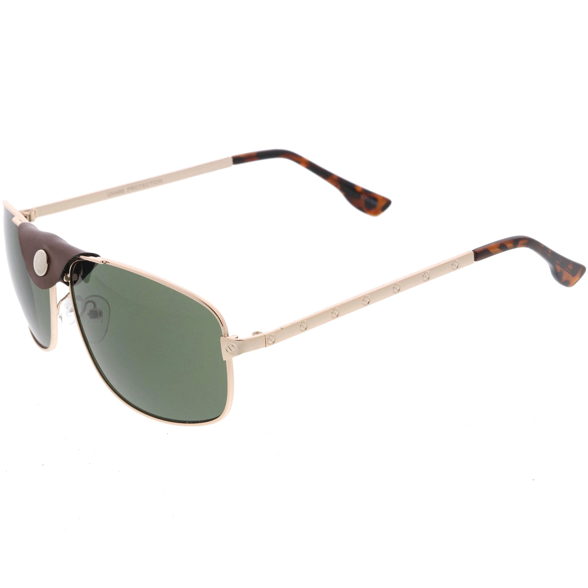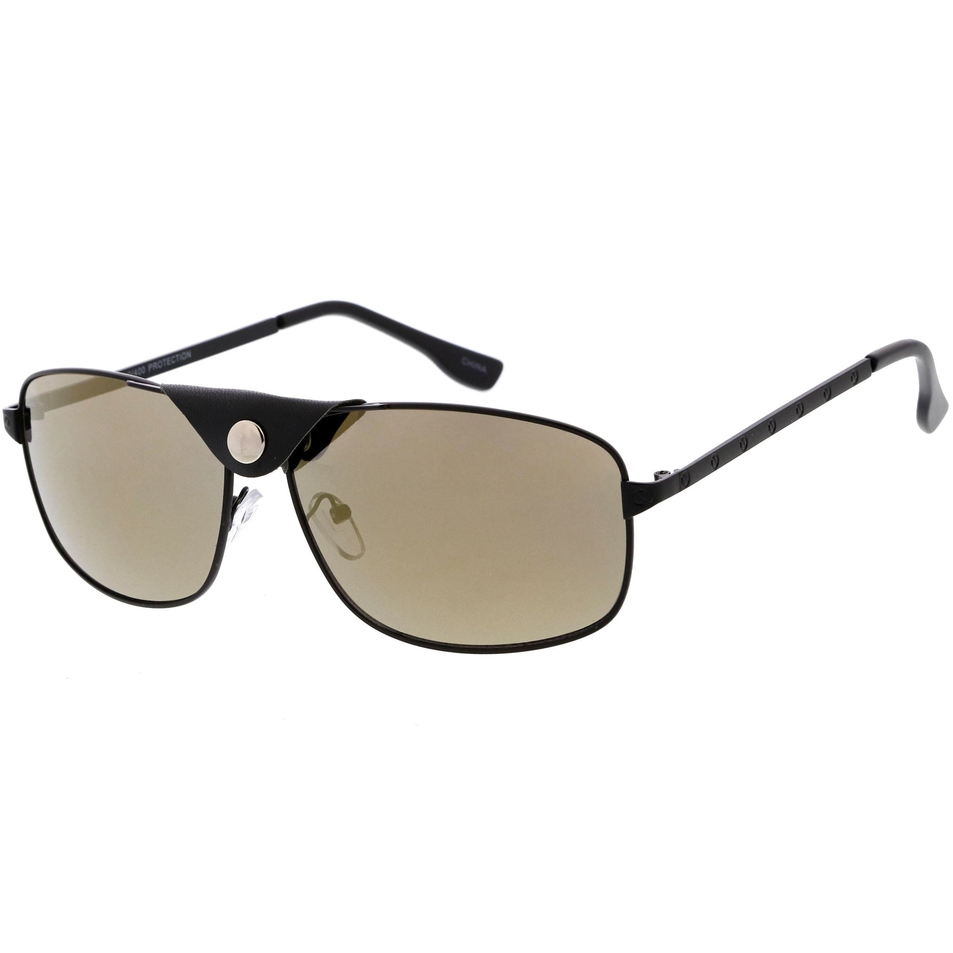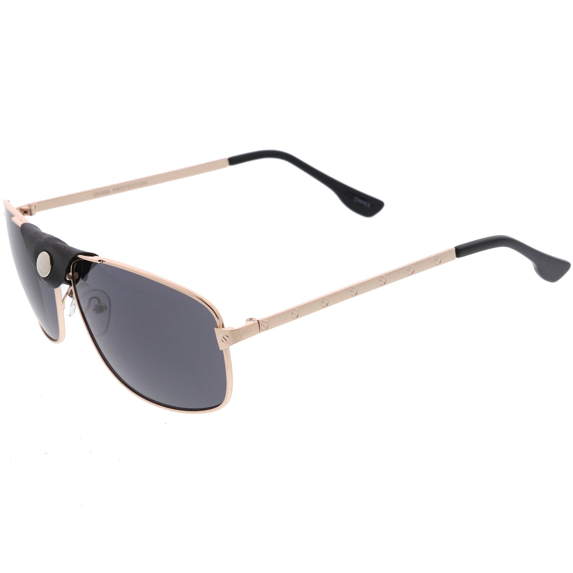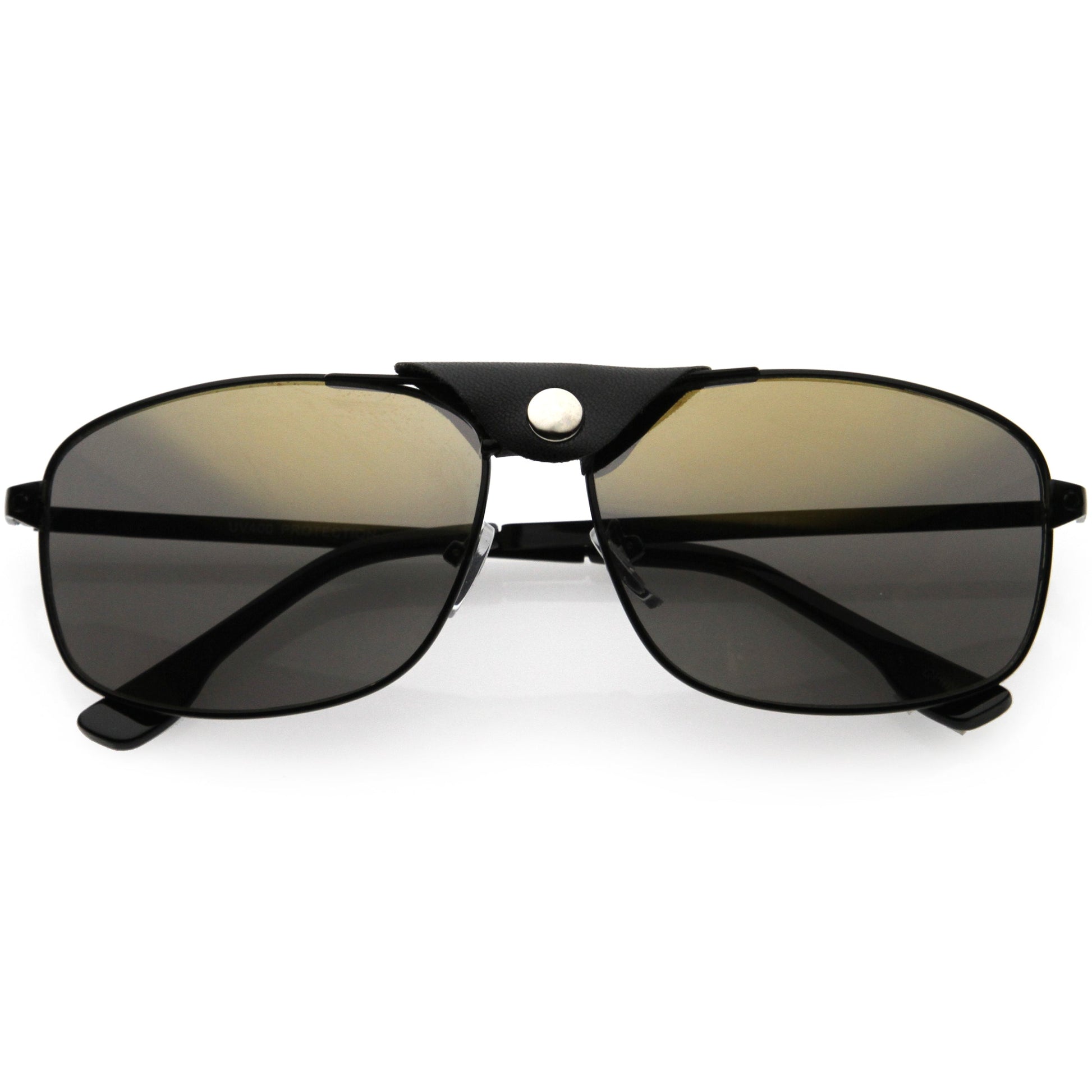 - Enhanced with a Removable faux leather tab that wraps around the brow bar, these classic pair of square aviator sunglasses are made with neutral colored lenses that offer quality sun protection. Pair them with your favorite shirt for a classy timeless aura. Made with a metal based frame, metal hinges, and 100% UV protected lenses.