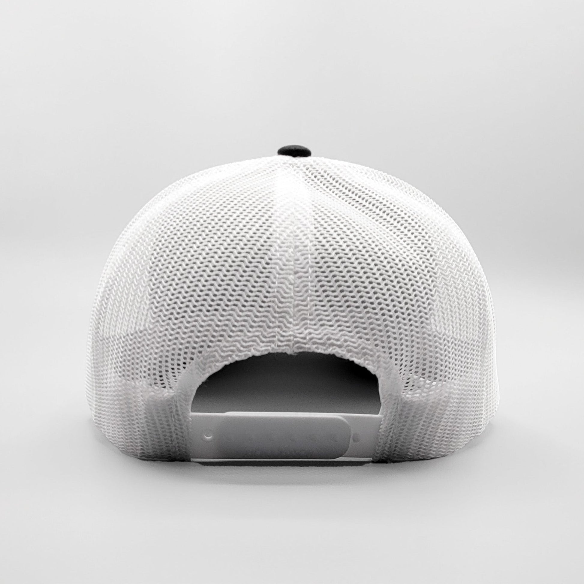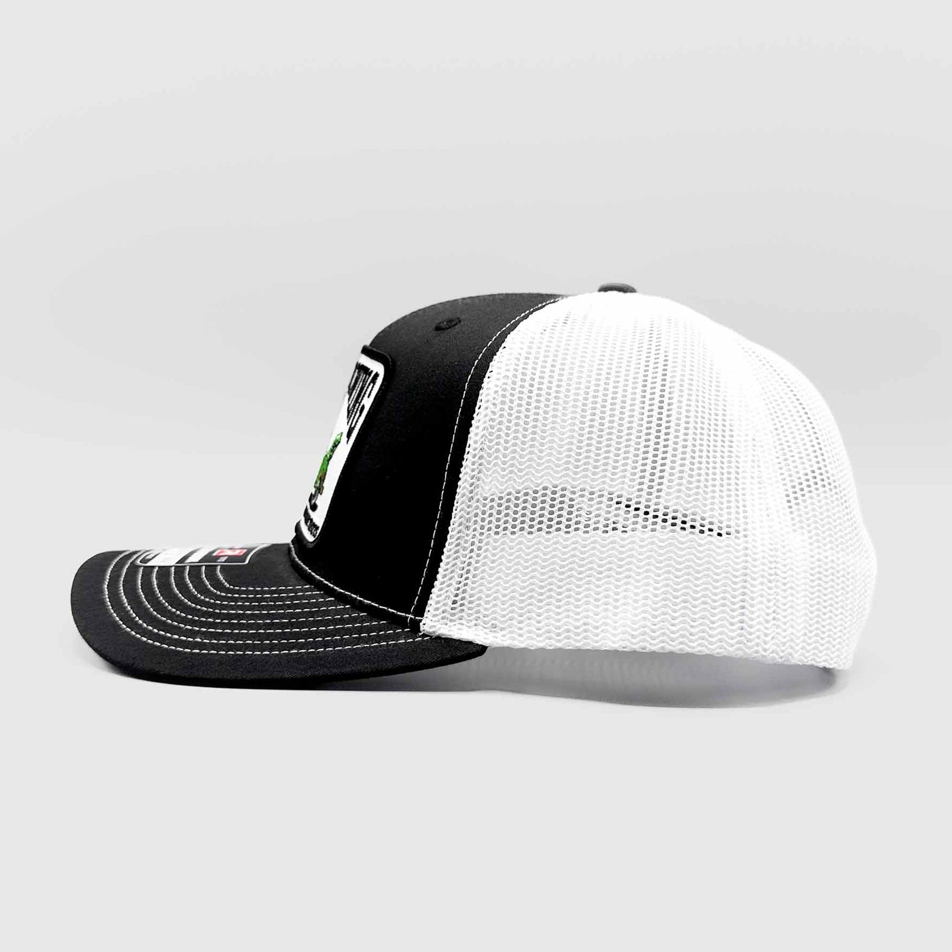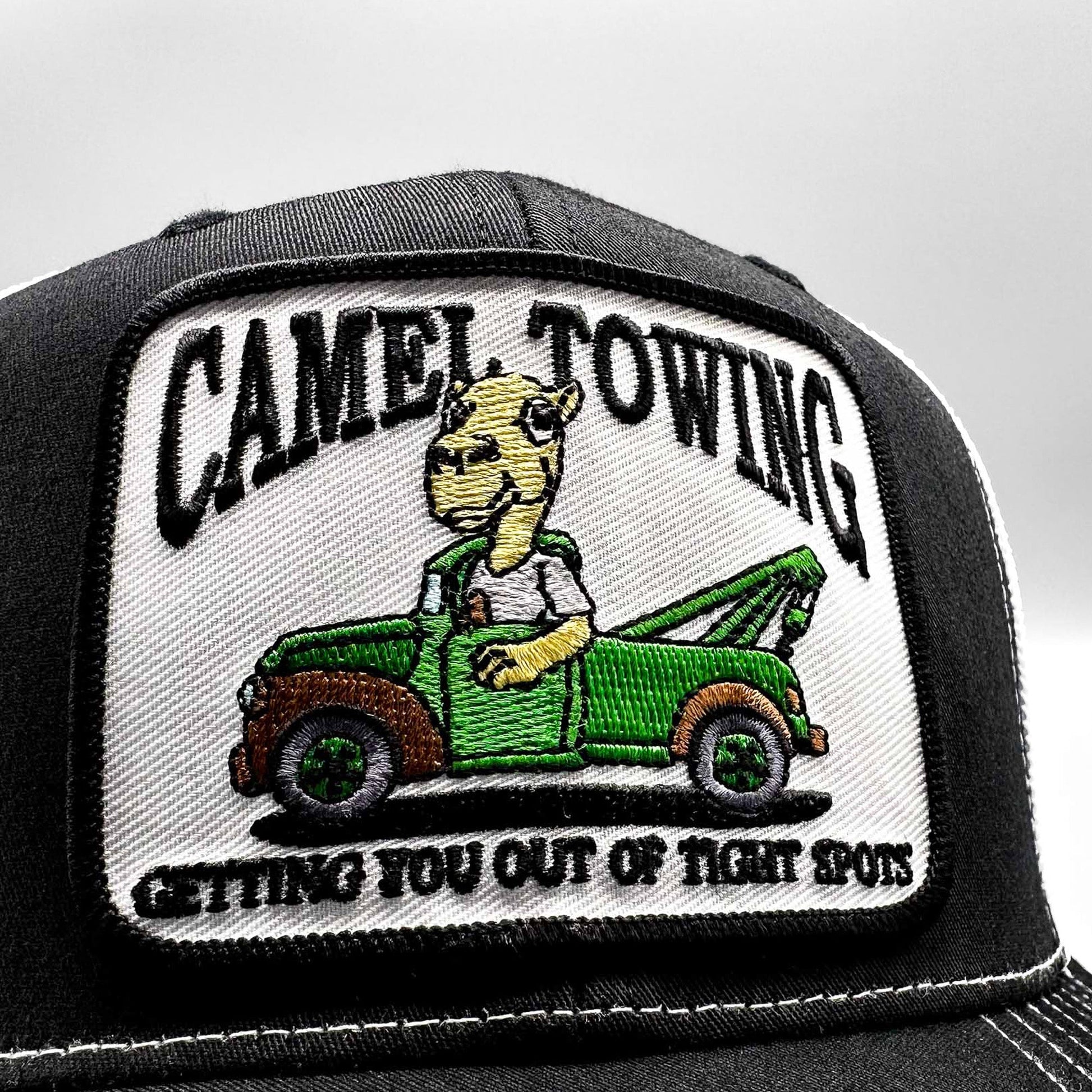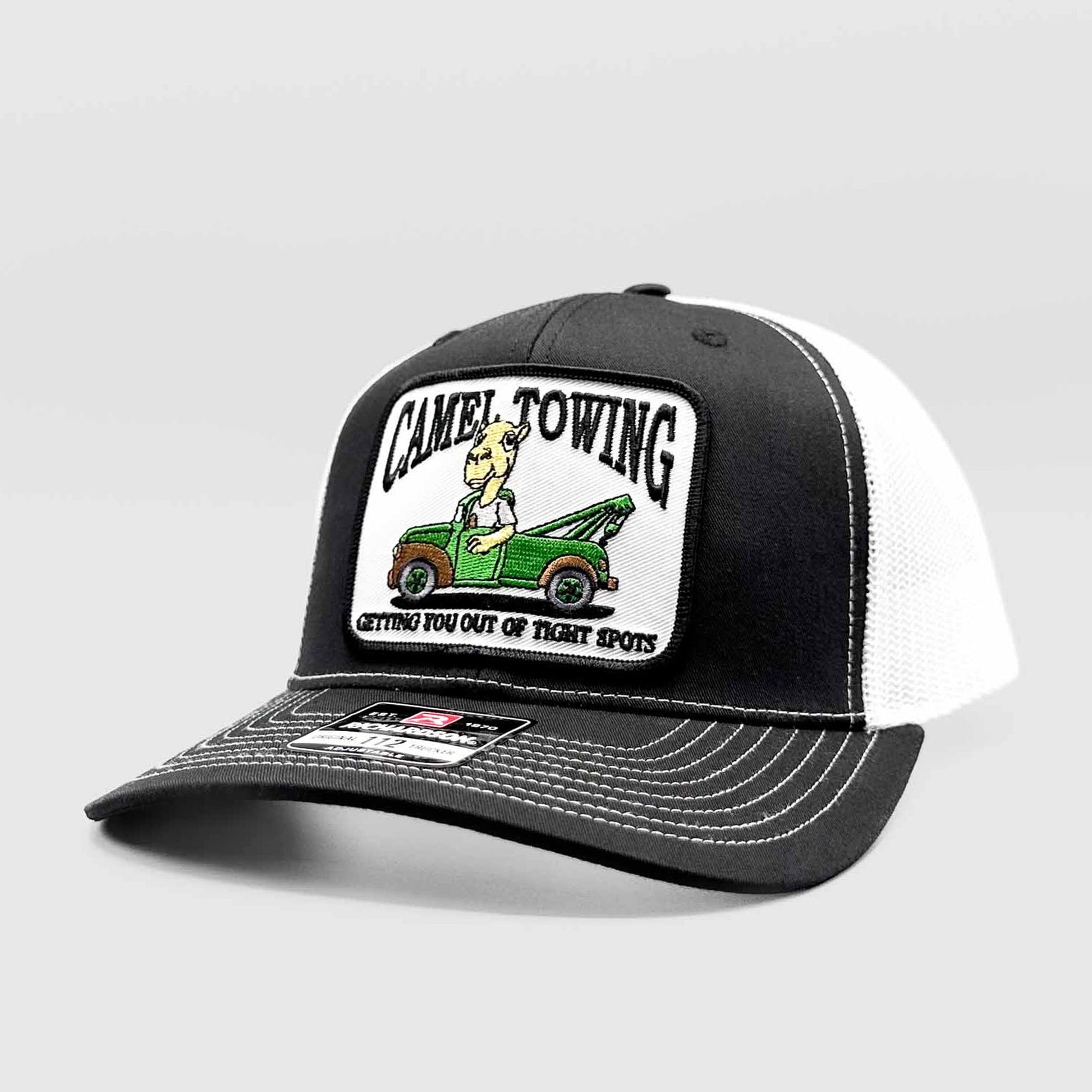 This is a funny Camel Towing Company "Getting You Out of Tight Spots" patch on a new black and white mesh Richardson 112 snapback trucker hat.
