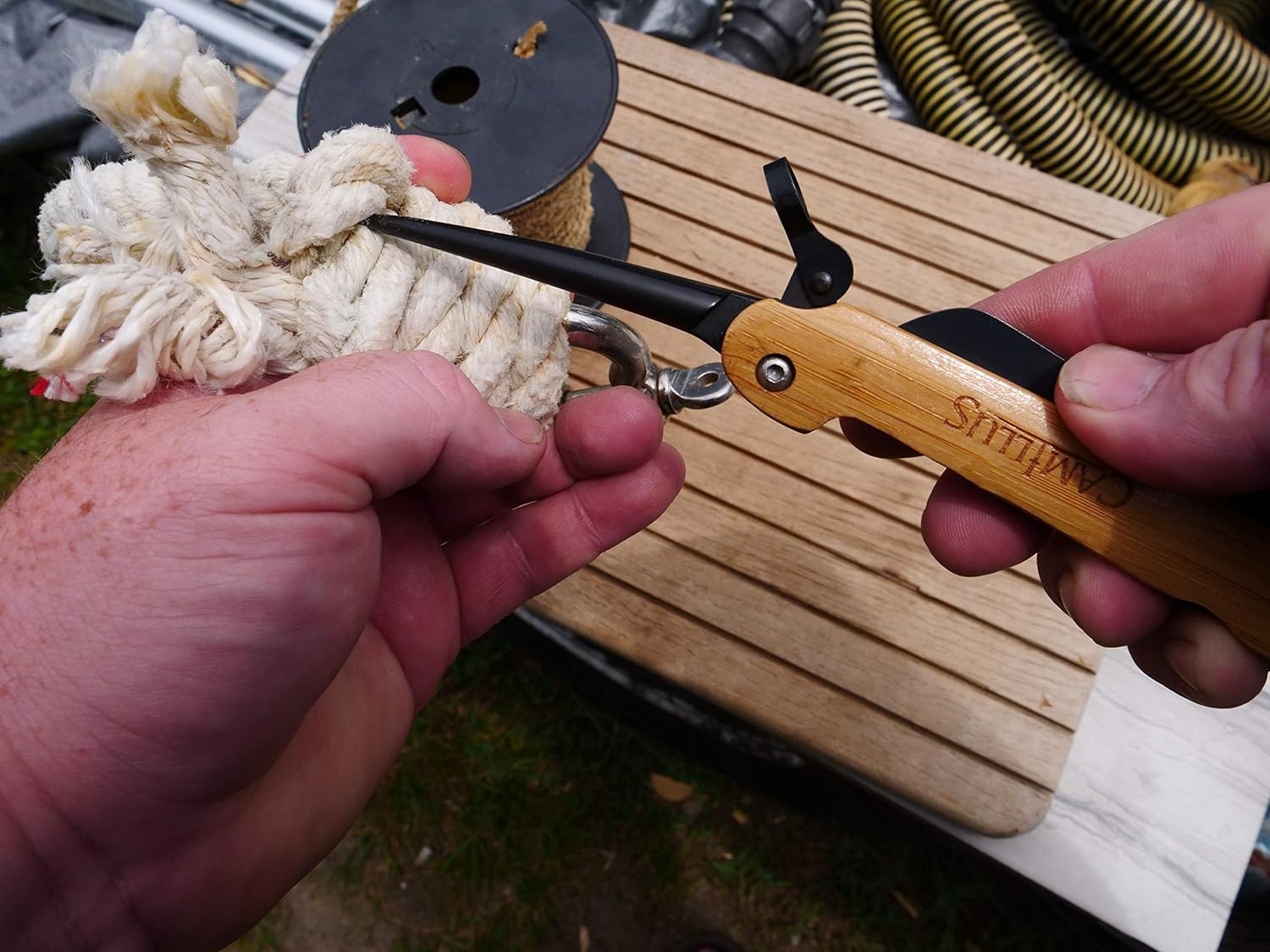 The Camillus 7.5″ Folding Knife features an integrated Marlin Spike, Bamboo Handle and AUS-8 Steel components. The AUS-8 component steel offers exceptional balance between toughness, edge sharpness, and corrosion resistance. Additionally, the steel is bonded with Carbonitride Titanium to provide an added layer of unparalleled rust and corrosion resistance. The same treatment also makes the components up to 10x harder than untreated steel, affording exceptional strength and edge retention over time. Featuring a robust dual locking system as well, the Marlin Spike can be locked into place when not in use. When in use, it can help loosen knots with ease. In addition it can be used for unlaying rope and completely untying knots. Backed by our Lifetime Warranty as well, this bastion of versatility would make a fine addition to any outdoorsman’s gear kit or fisherman’s tackle box.