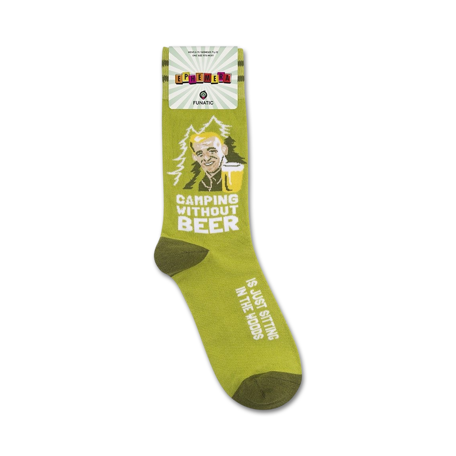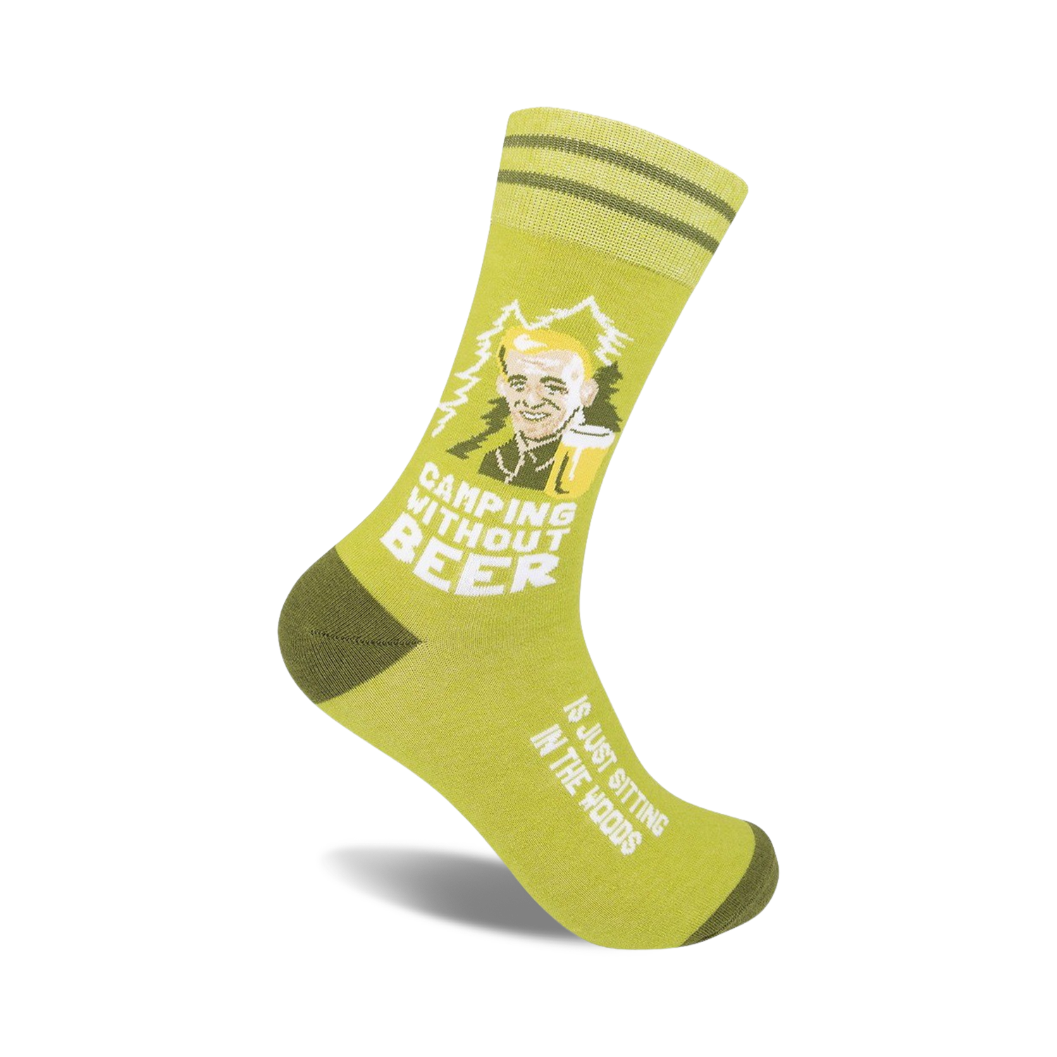 Camping socks with a cartoon of a bald man drinking a beer and the phrase 'Camping Without Beer...Is Just Sitting In the Woods'. This fun and quirky pair of socks is perfect for any camper who loves a good beer.