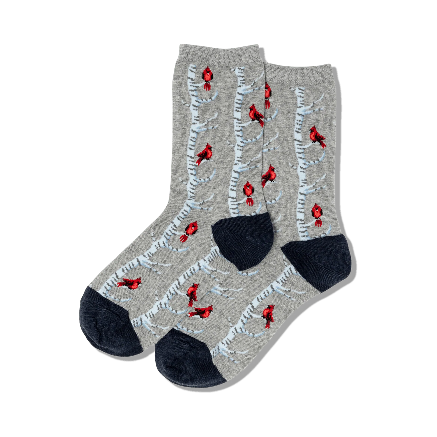 Jingle your way through the holidays with our festive "Cardinals in Birch Tree" women's crew socks! Picture this: red cardinals perched on snowy birch branches against a backdrop of pristine white snow. It's like wearing a winter wonderland on your feet. The dark blue toes and heels add a touch of sophistication, making these socks perfect for any holiday gathering. Fun fact: Did you know that cardinals mate for life? How romantic!