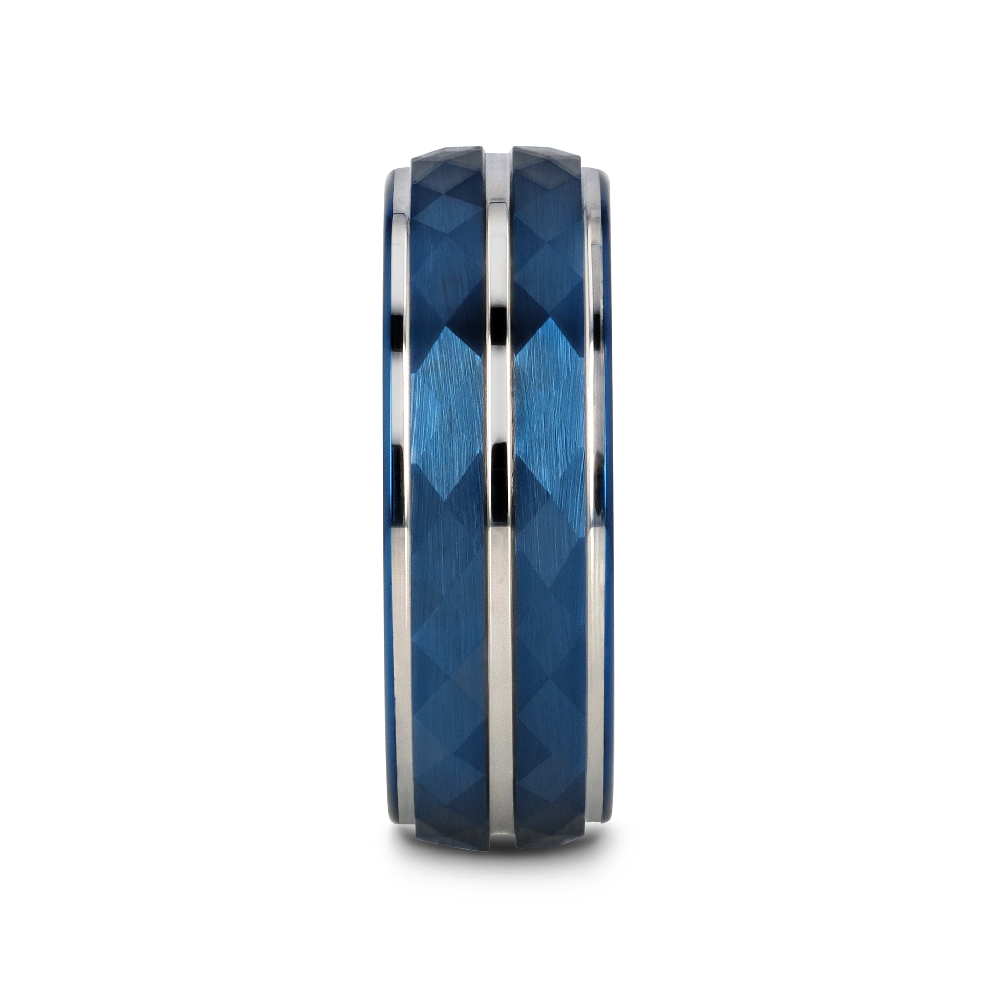 A real tour de blue. The CARMEL is a brilliant blue Tungsten band with Blue Ion plating. In the center, and on each edge, are silver, stepped inlays. The entire front has a faceted finish offering a unique texture and feel. It comes in an 8mm width and several sizes.