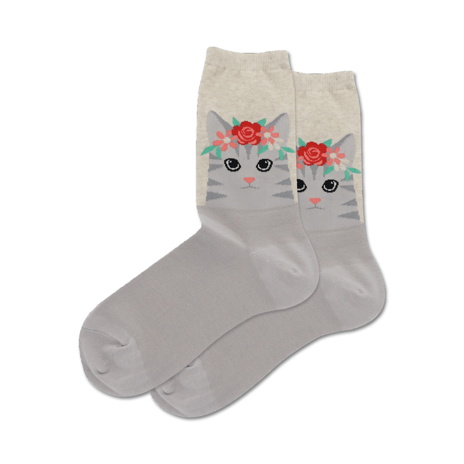 Strut your paws and show the world you're a cat lover with these jawsome Cat Flower Crown Crew Socks! They're just as adorable as your furry feline friends, only without the litter box. Picture this: pudgy cat faces with rosy cheeks at every angle, all sporting flower crowns that are just as festive as a cat party. Get paws-itive comments and smiles everywhere you go, whether you're in running shoes, sneakers, or boots. Talk about a 'meow-nificent' fashion statement!