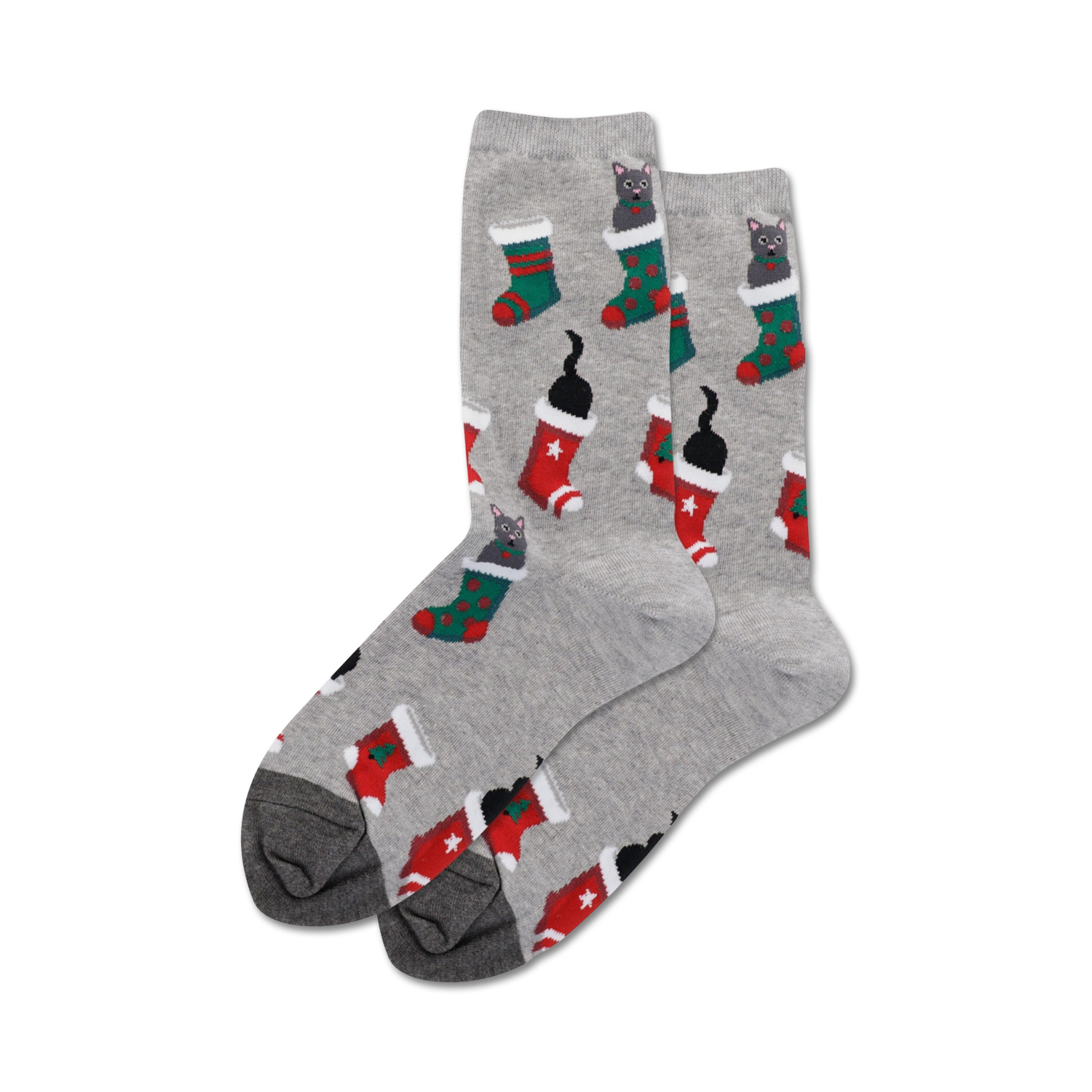 Looking for a stocking stuffer that's sure to bring a smile? Look no further than these festive women's crew socks featuring a pattern of adorable black cats wearing red and green stockings with white cuffs and stars. Just like Santa's nine lives, these socks are perfect for celebrating the magic of Christmas with a touch of cat-titude!