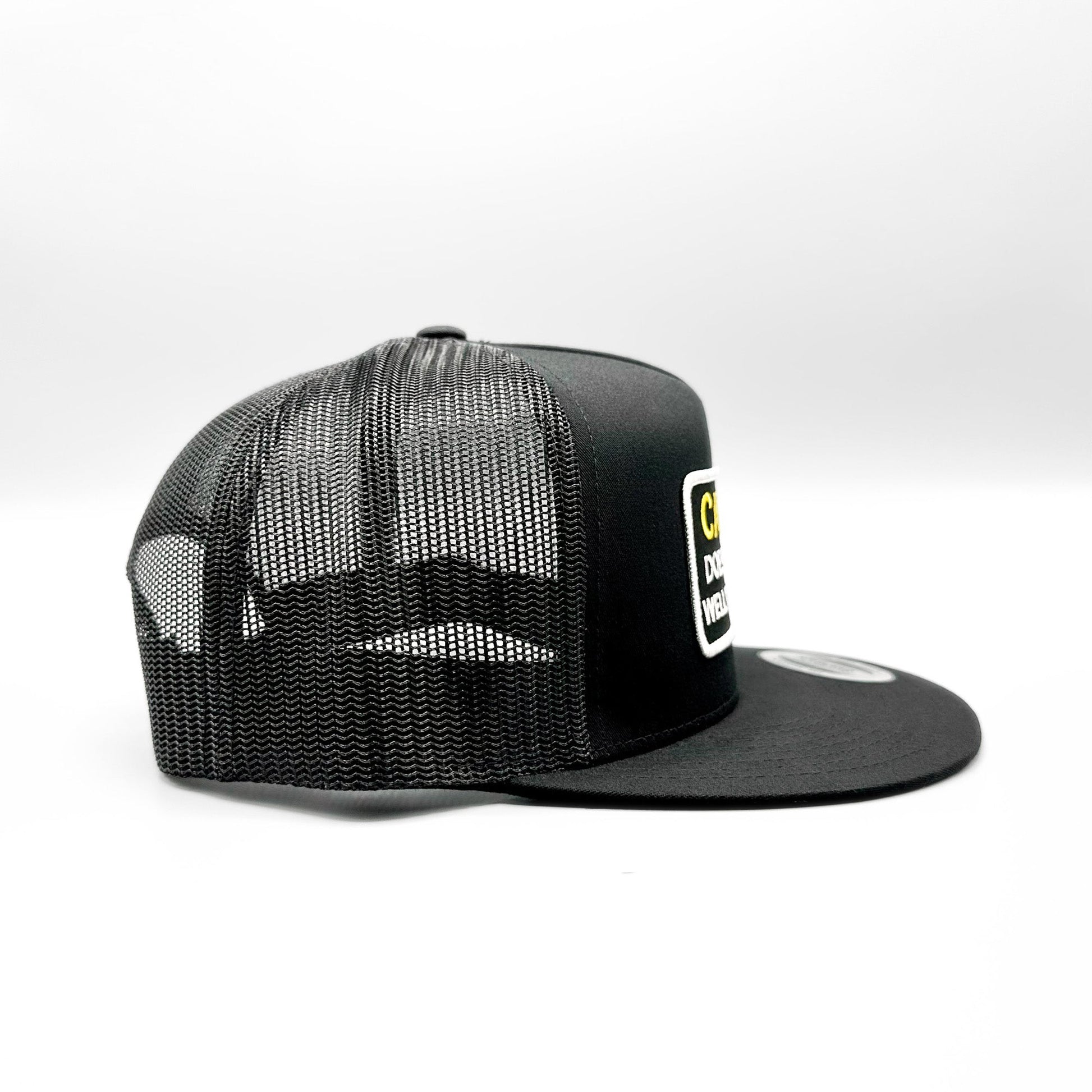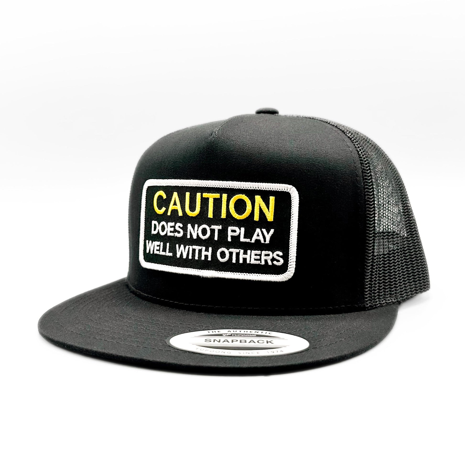 This listing is for a funny "Caution Does Not Play Well With Others" embroidered patch on one of our best-selling (and best fitting) baseball style trucker hats - a black Yupoong 6006 Classic snapback trucker hat.
