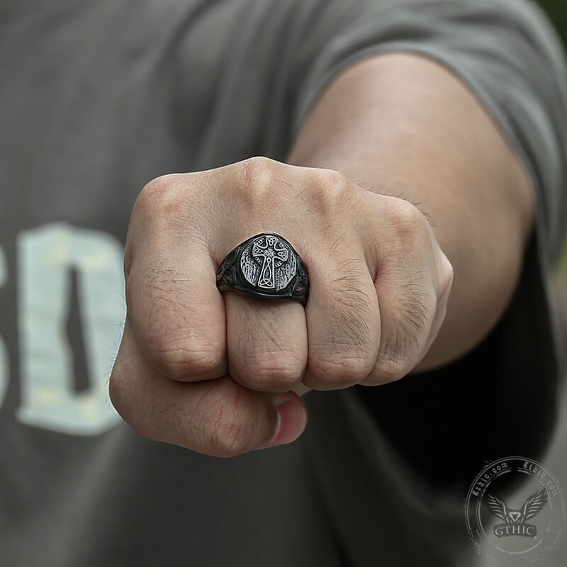This men’s or women’s ring makes to a unique wedding or engagement band. This exceptional ring is considered to be 'Top of the Range' regarding quality and style. The beautiful braided Celtic pattern really stands out against the Oxidized background creating a strong contrast between Silver and Black. And this ring uses the Celtic knot to complete a devout cross pattern well.