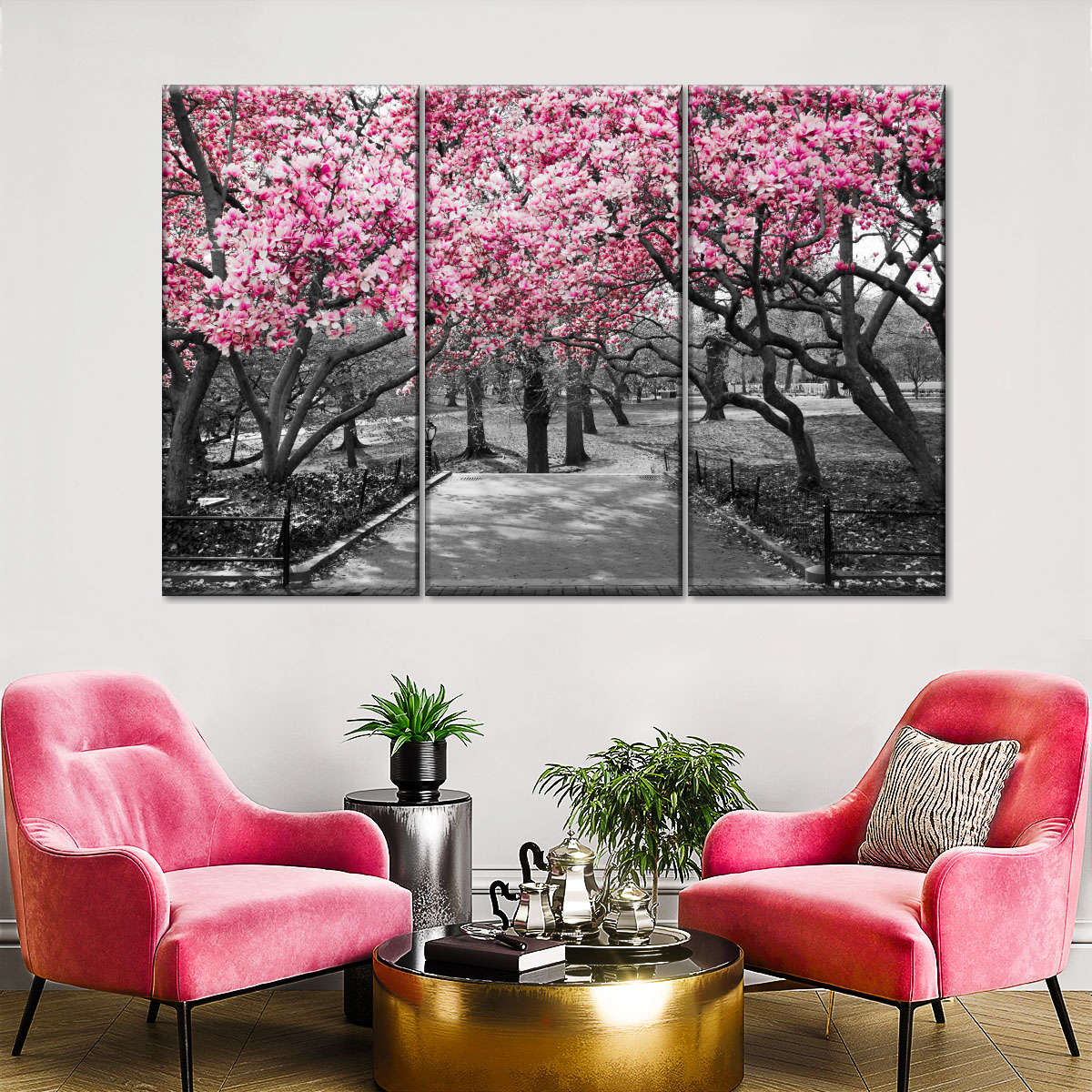 New York Cherry Blossoms Multi Panel Canvas Wall Art will refresh your mind and soul whenever you stop and stare at it. This high-quality art print will complement any room in your home and soothe your senses with nature's beauty.