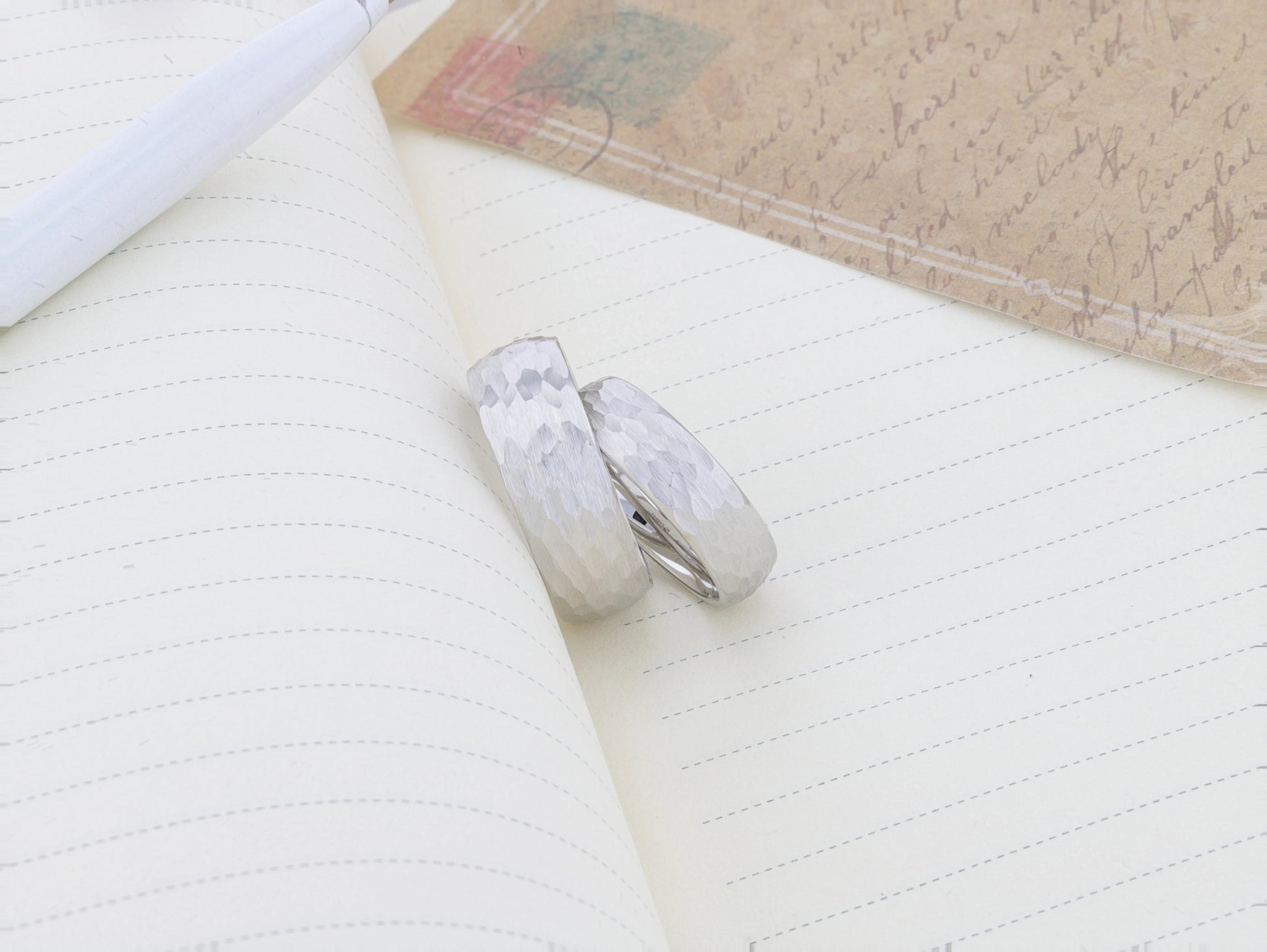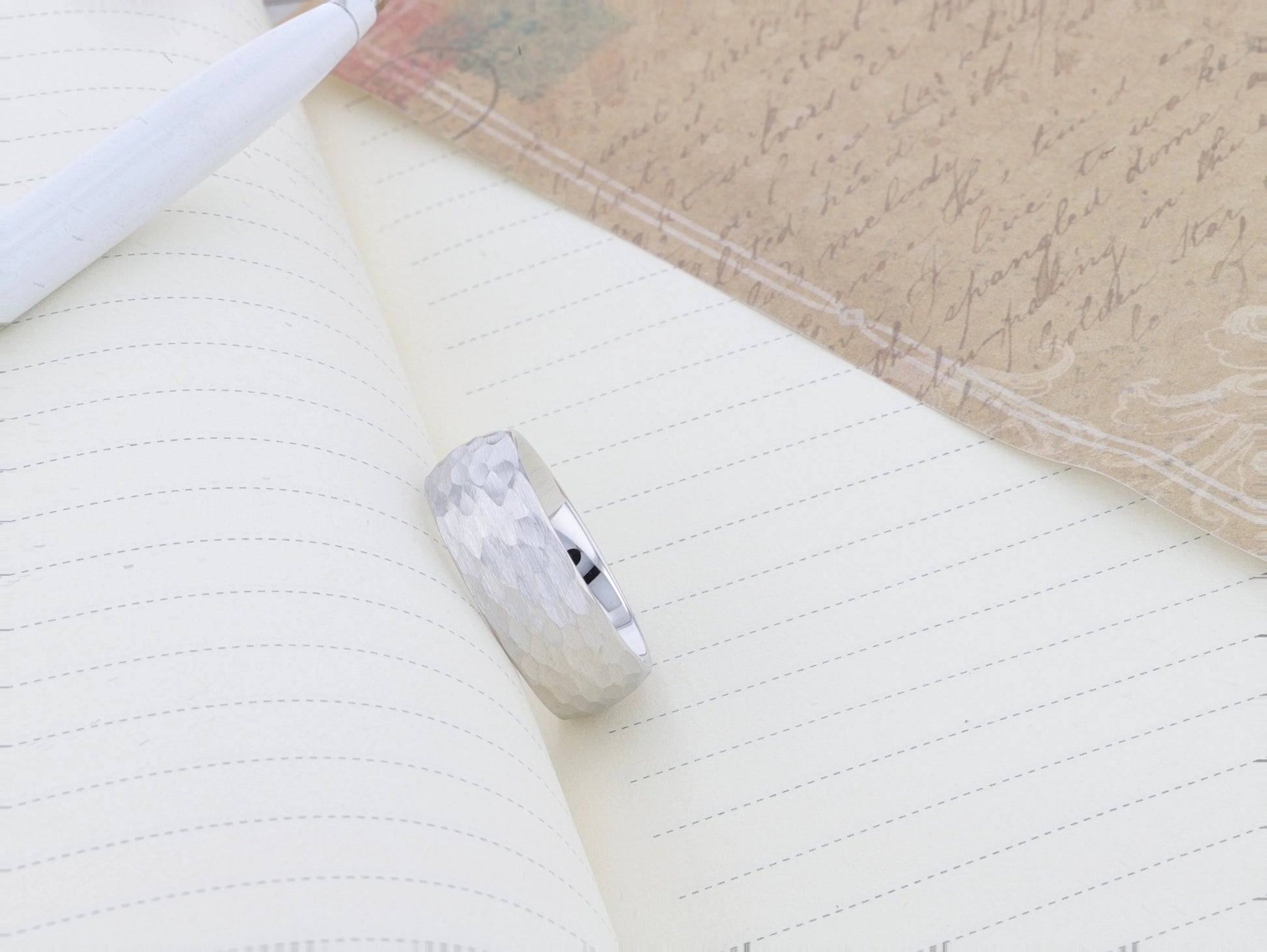 This beautiful White Tungsten Carbide wedding band design by Thorsten features a domed profile with a beautiful hammered finish all over its surface and can be worn as a wedding band or promise ring.