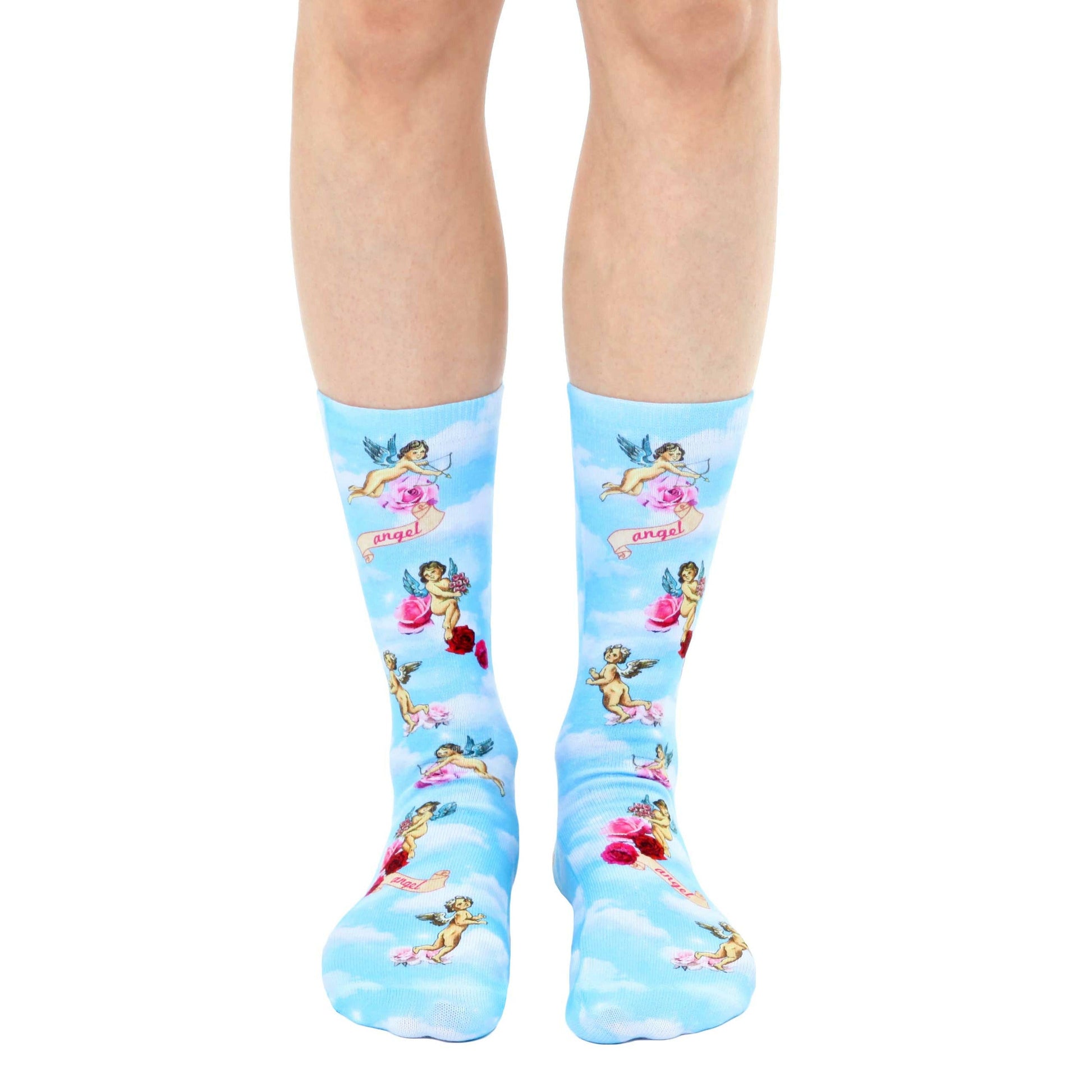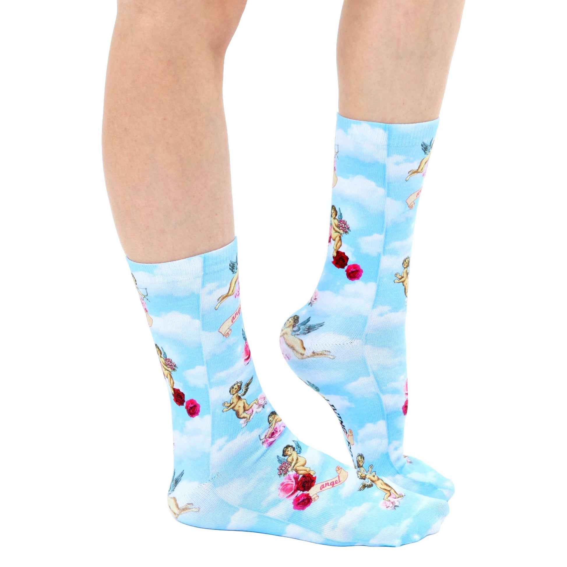 Cupid's crew: Socks that'll make you feel like you're walking on clouds! These light blue socks feature a pattern of cherubs, clouds, and roses, a reminder that love is all around us. Whether you're running errands or floating through a daydream, Cherub socks will keep your feet happy and stylish.