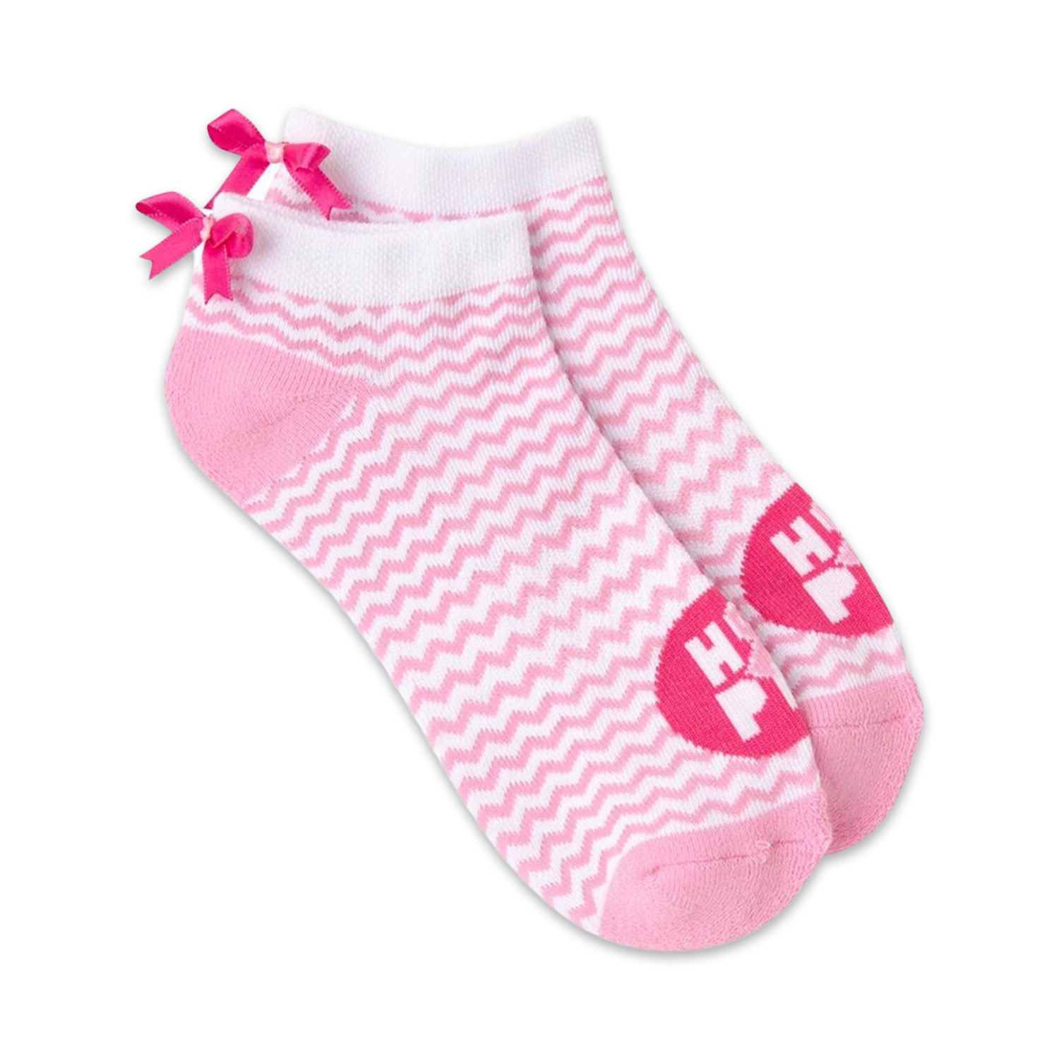 Introducing Chevron Ribbon socks, the cutest way to spread hope during Breast Cancer Awareness Month! These socks feature a vibrant pink and white chevron pattern with a darling pink bow at the top, a message of hope on the sole, and the letters "HP" nestled in a sweet pink heart on each ankle. Slip into these comfy socks and let your feet do the talking - because even the smallest gesture can make a big difference.