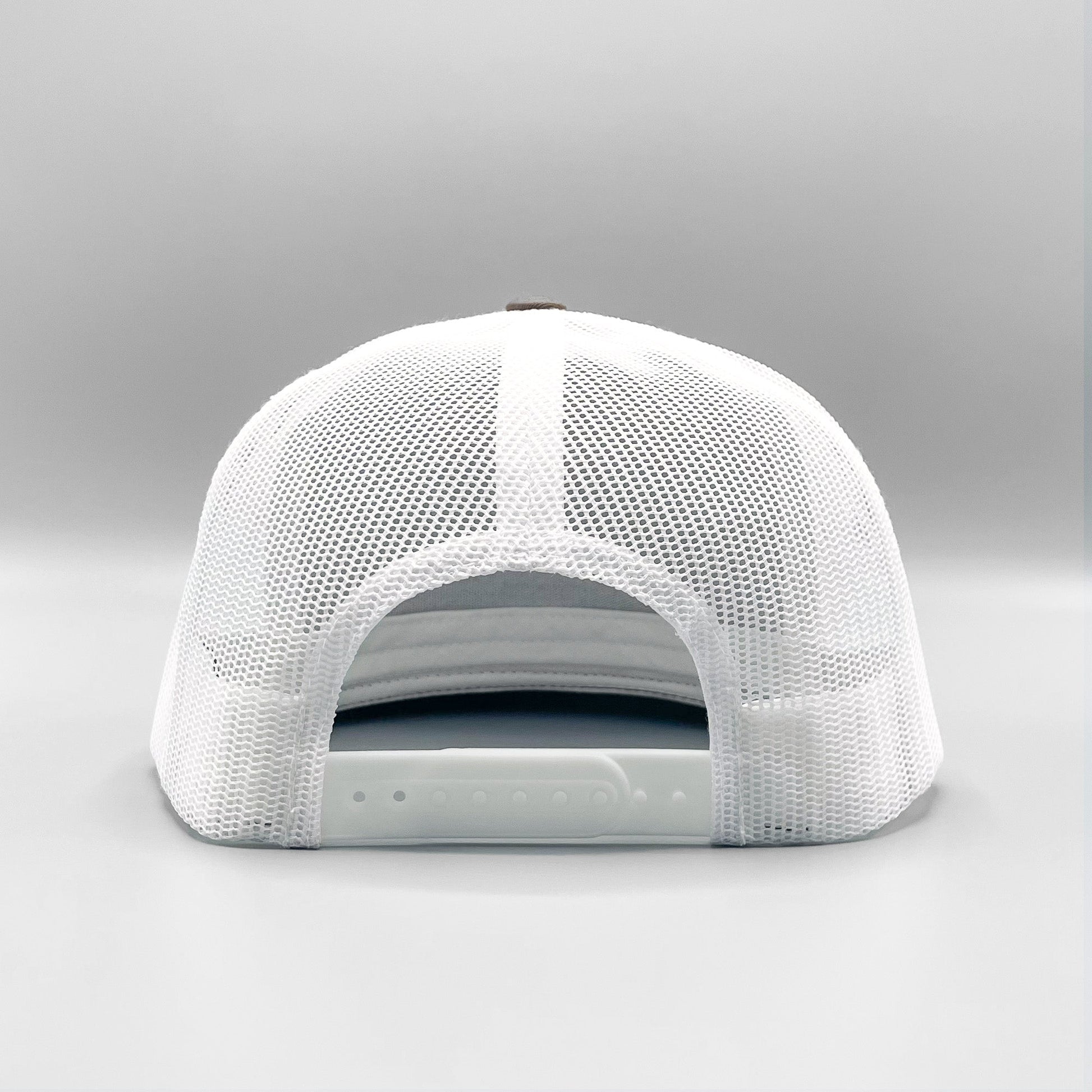 This trucker features an embroidered Square Body logo patch on a new Yupoong 6006 Classic mesh snapback brown and white mesh snapback trucker hat.