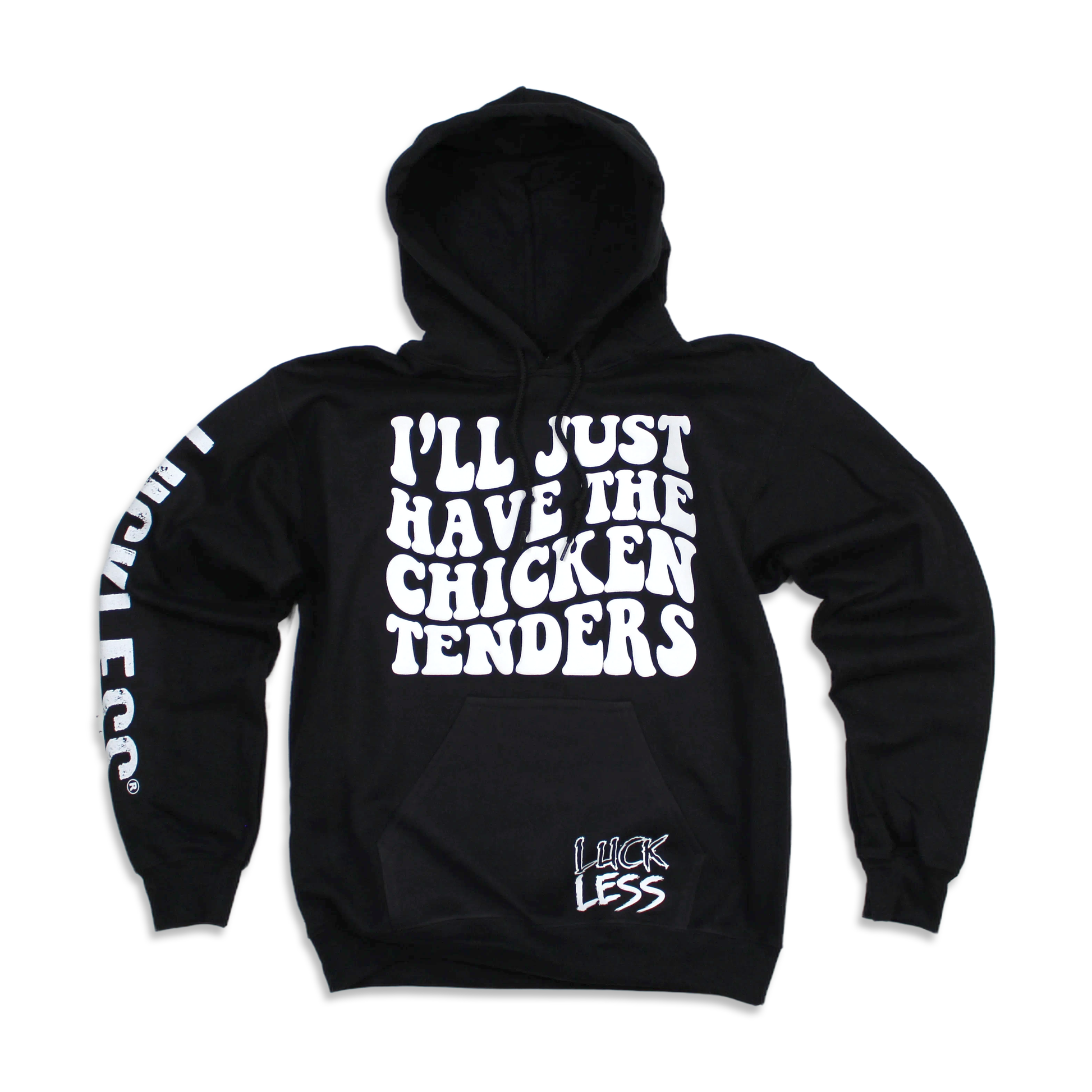 Hey, babes! Are you tired of scouring menus just to end up ordering the same thing? You know, the oh-so-reliable chicken tenders? Don't hide it, OWN IT! Slip into our cozy black hoodie that boldly declares, "I'll just have the chicken tenders" in sassy white lettering. It's the ultimate go-to for food indecisiveness and for keeping you warm during those chilly "what should we eat" debates. It's soft, it's comfy, and it basically orders for you—what's not to love? Make a statement without saying a word, and look cute while doing it. 🐔💖