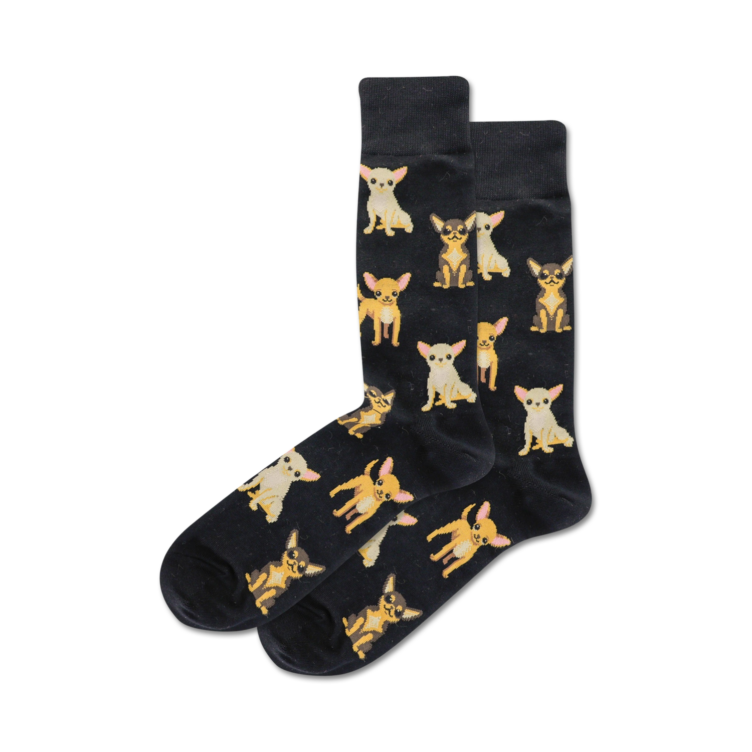 Kick off your day with a yippee! Our Chihuahua Crew Socks are perfect for your canine-loving feet. Join paws with these fun and colorful socks featuring a quirky pattern of cartoon Chihuahuas in brown, tan, and white. Great for elevating your everyday style, or for a doggone good time on the town!