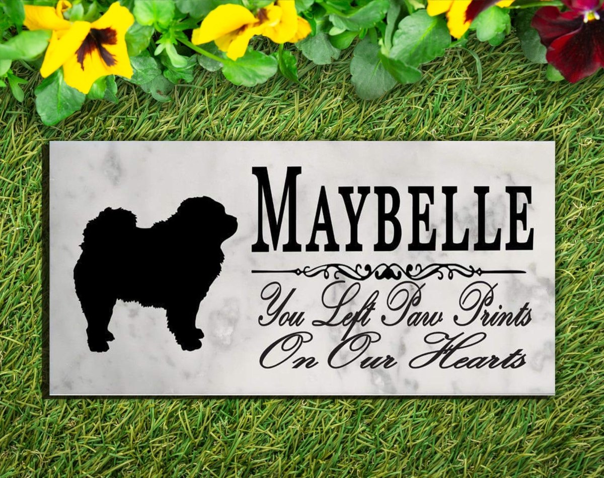 This personalized Your Left Paw Prints On Our Hearts Chow Chow dog memorial or dog grave marker is a wonderful remembrance to a faithful and loved pet Chow Chow. Personalized with your dog's name this solid Marble stone plaque is perfect indoors as a pet memorial or outdoors as a grave marker or headstone. This elegant Marble stone Chow Chow memorial plaque weighs about 2.5 lbs and is 12in x 6in and 3/8in in thickness.