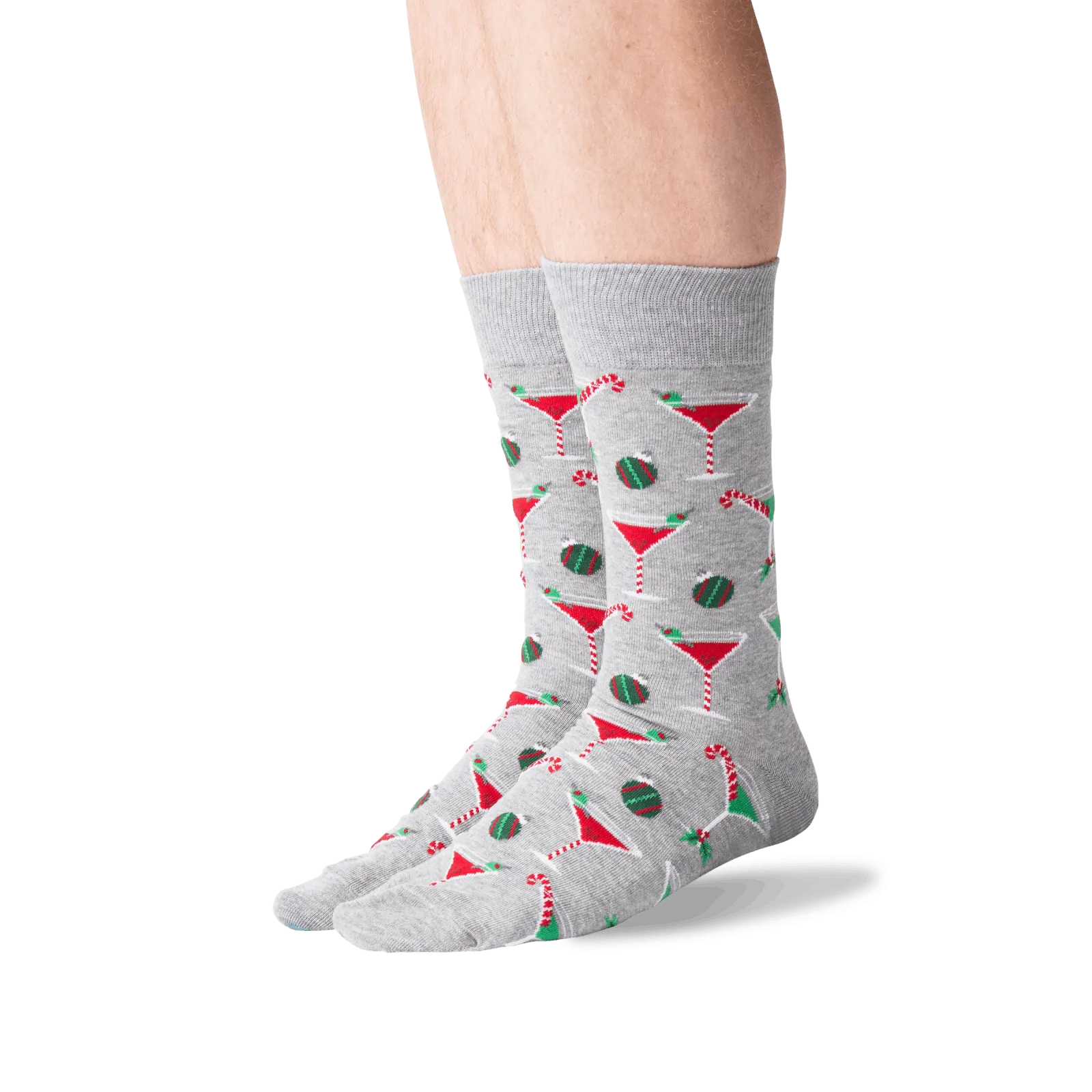 Hey, ho, ho, let's go! Get your Christmas cheer on with these cocktail-themed crew socks for men. These black socks feature a pattern of martini glasses, candy canes, and holly leaves. Who's naughty or nice? Hard to say, but you'll be feelin' merry and bright when you wear these festive socks.
