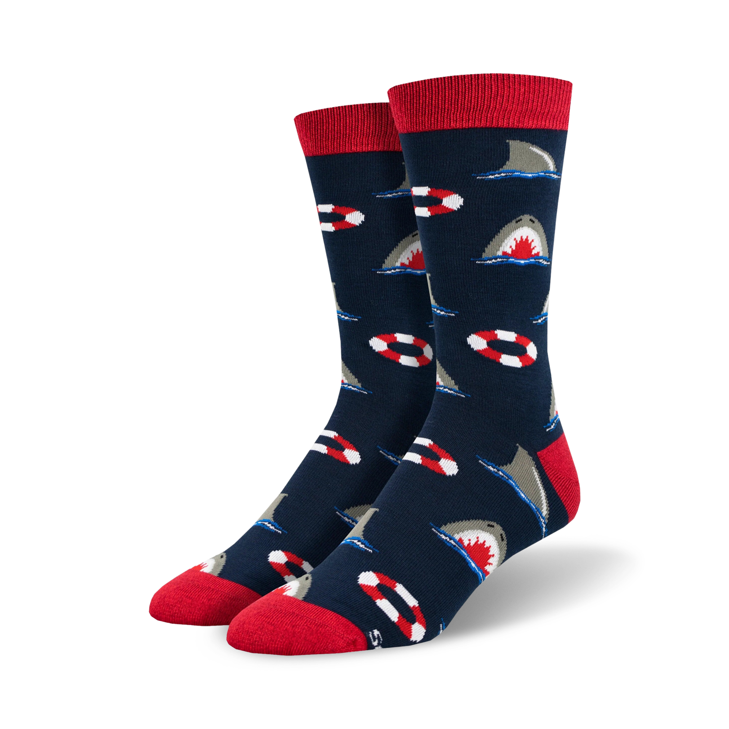 Feast your eyes on our Chumming The Water Bamboo novelty socks the great white sharkiest socks you'll ever fin-d! Picture this: a deep blue sea teeming with hungry great white sharks circling inviting red and white life preservers. Wear these crew-length socks and let the jaws-dropping design take you on an underwater adventure. Perfect for men with a taste for the wild side, these socks are a guaranteed conversation-starter. So, dive in, make a splash, and let the sharks take a bite out of your feet ?ª metaphorically speaking, of course!