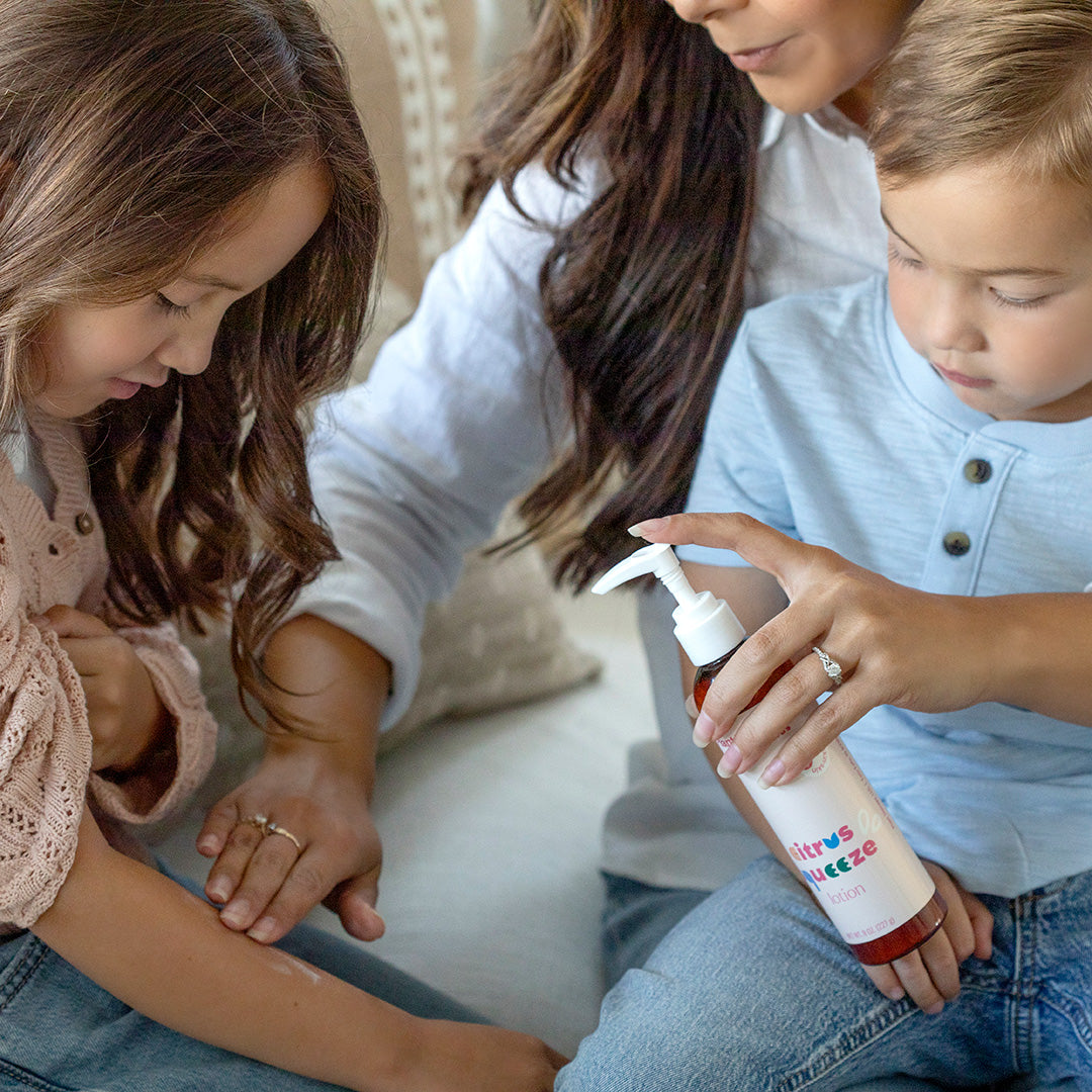 Bring a little sunshine to your child’s daily routine with Citrus Squeeze Lotion! Lightly scented with a cheerful blend of citrus and floral essential oils, this gentle lotion keeps skin soft and smooth, without feeling heavy or greasy.
