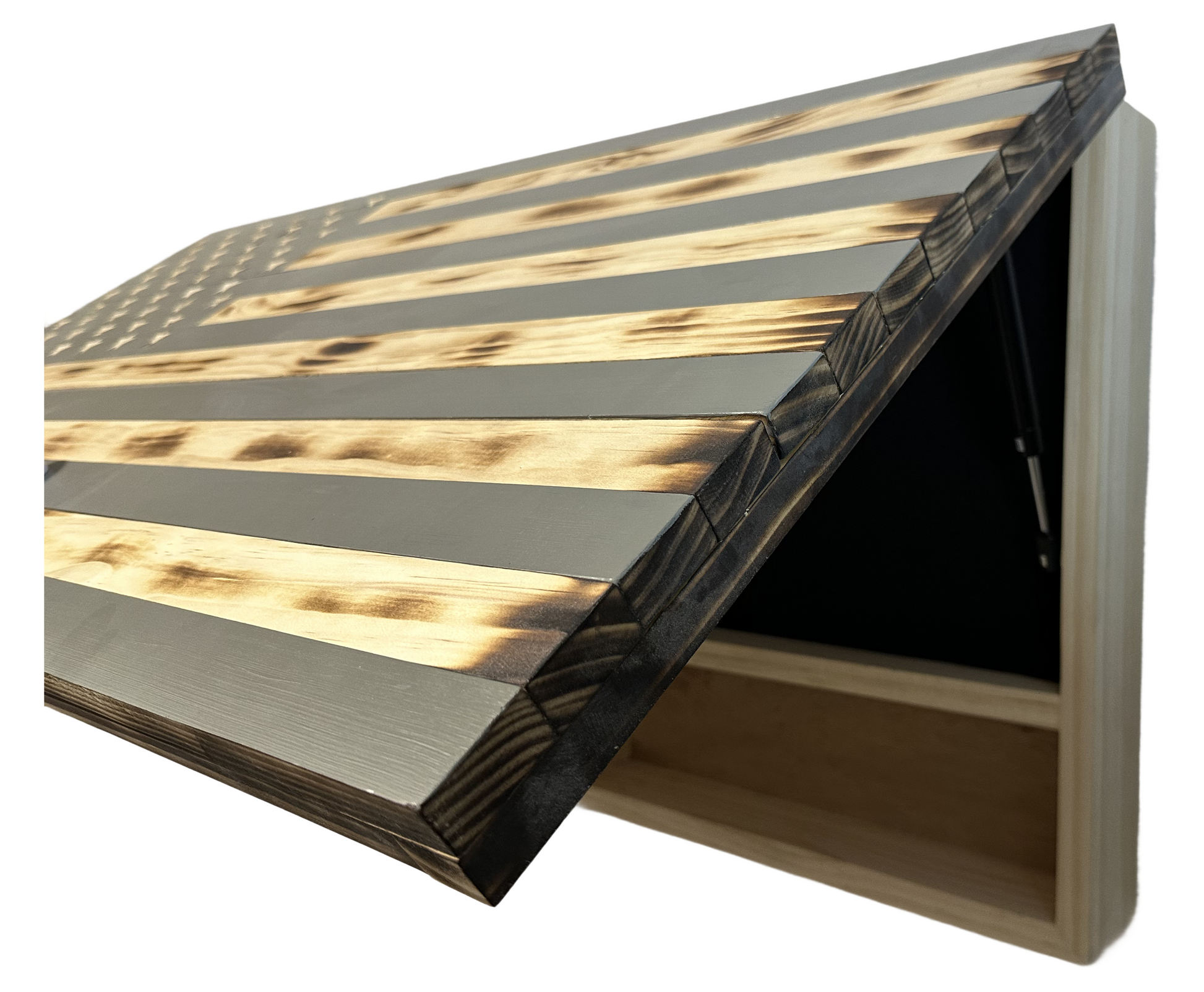 - Patriotic & Secure: Classic burnt wood American flag design with hidden firearm storage.